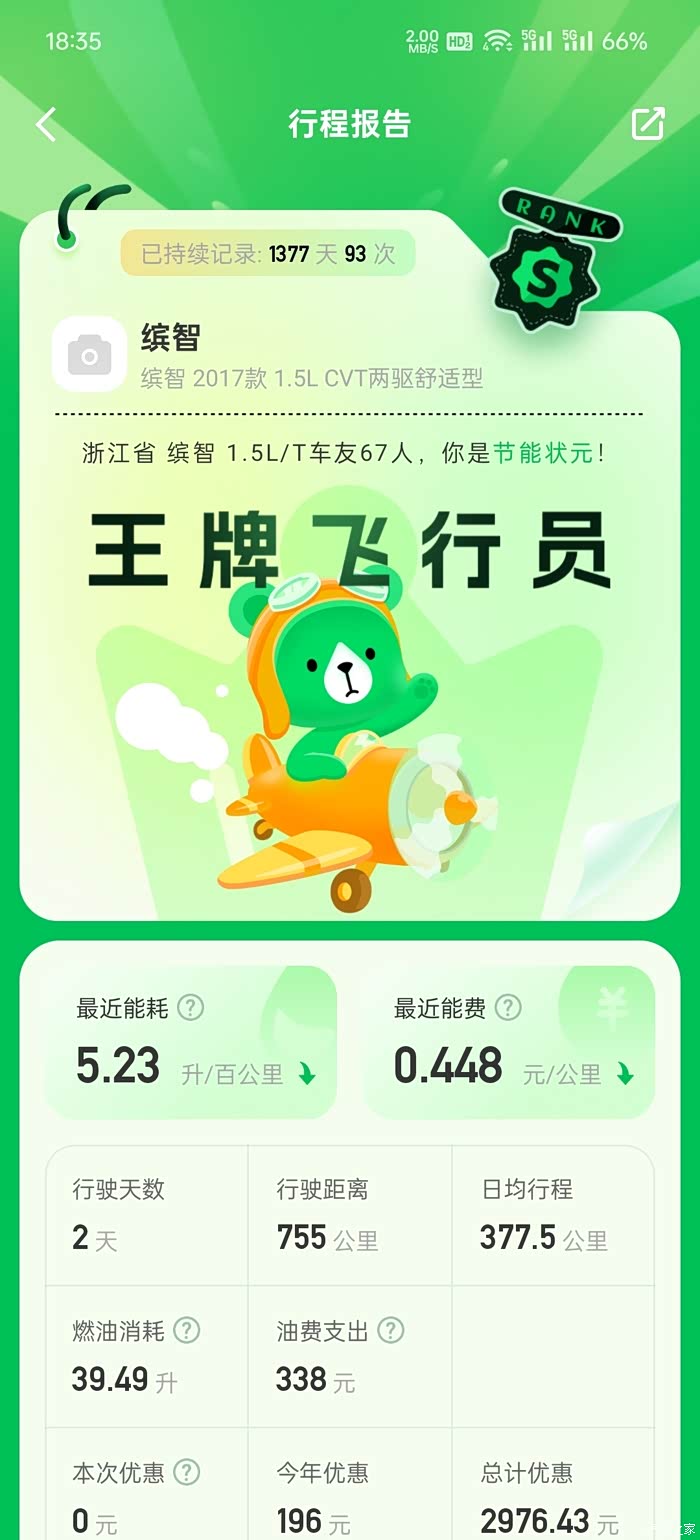 气温回暖,缤智引以为傲的低油耗又回来了。一箱油42升,跑了750公里