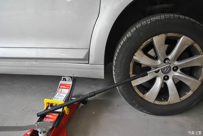 螺丝都松动了,就可以正式用千斤顶顶起车身了。话说还是这个液压的方便,顶个车跟玩似的,原车的手摇式千斤顶不知要弄到几时。买了这工具,今天是第4次用它了。