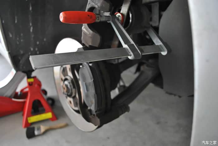 压回活塞我用了个木工F夹,撬棒垫平活塞,F夹压回。有了空位,就能上新刹车片了。