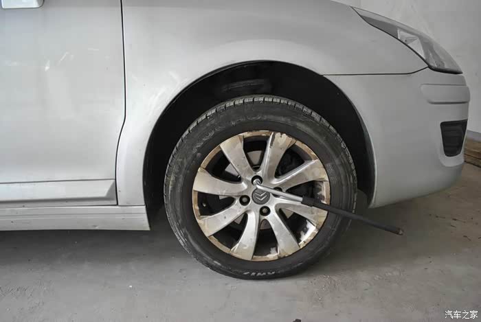 千斤顶稍稍顶住车身后,先把轮胎螺丝松动一下,论坛螺丝用17mm套筒。这辆汽车在汽修厂时轮胎螺丝用风炮上紧过,一根加力棒上去还是纹丝不动。