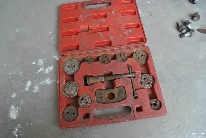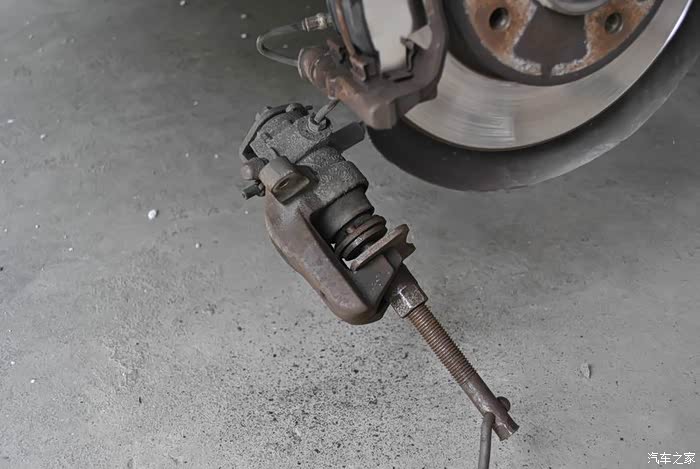 后轮就要废点劲了,两根固定螺丝都要取下。因为有手刹线,翻不动。后轮制动活塞和前轮不同,需要一边旋转一边压入。这时就需要专用工具了。