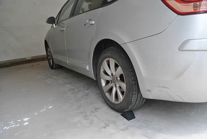 顶车的第一步,把2个汽车止退器一前一后安放在轮胎下,防止顶高汽车后汽车移动产生事故。