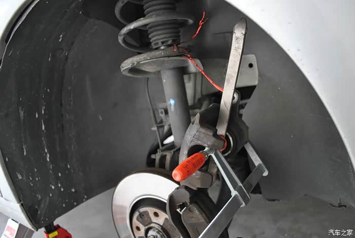 上面一颗固定螺丝不动,上手撬棒把卡钳撬松。直接把卡钳向上翻,取段铜丝穿过螺丝孔拴在减震弹簧上。省得卡钳掉下来扯坏线路。