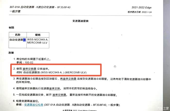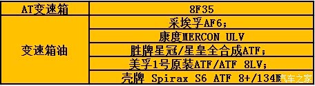 福特8F35/24变速箱油须是符合MERCON® ULV标准(WSS-M2C949-A)要求的低粘度油,市面上只要标着WSS-M2C949-A标准的变速箱油均可用于福特8AT。另外“MERCON”字面意思就是自动变速箱油。