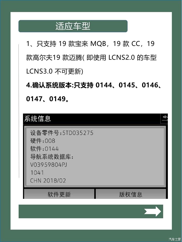 1. 适用车型:只支持19款宝来MQB、19款CC、19款高尔夫、19款迈腾(即使用LCN S2.0的车型,LCN S3.0不可更新)。