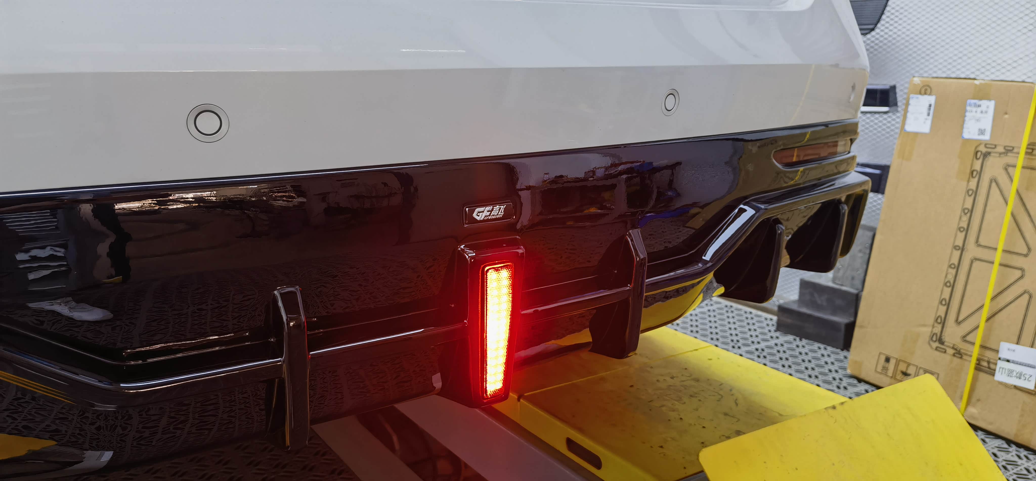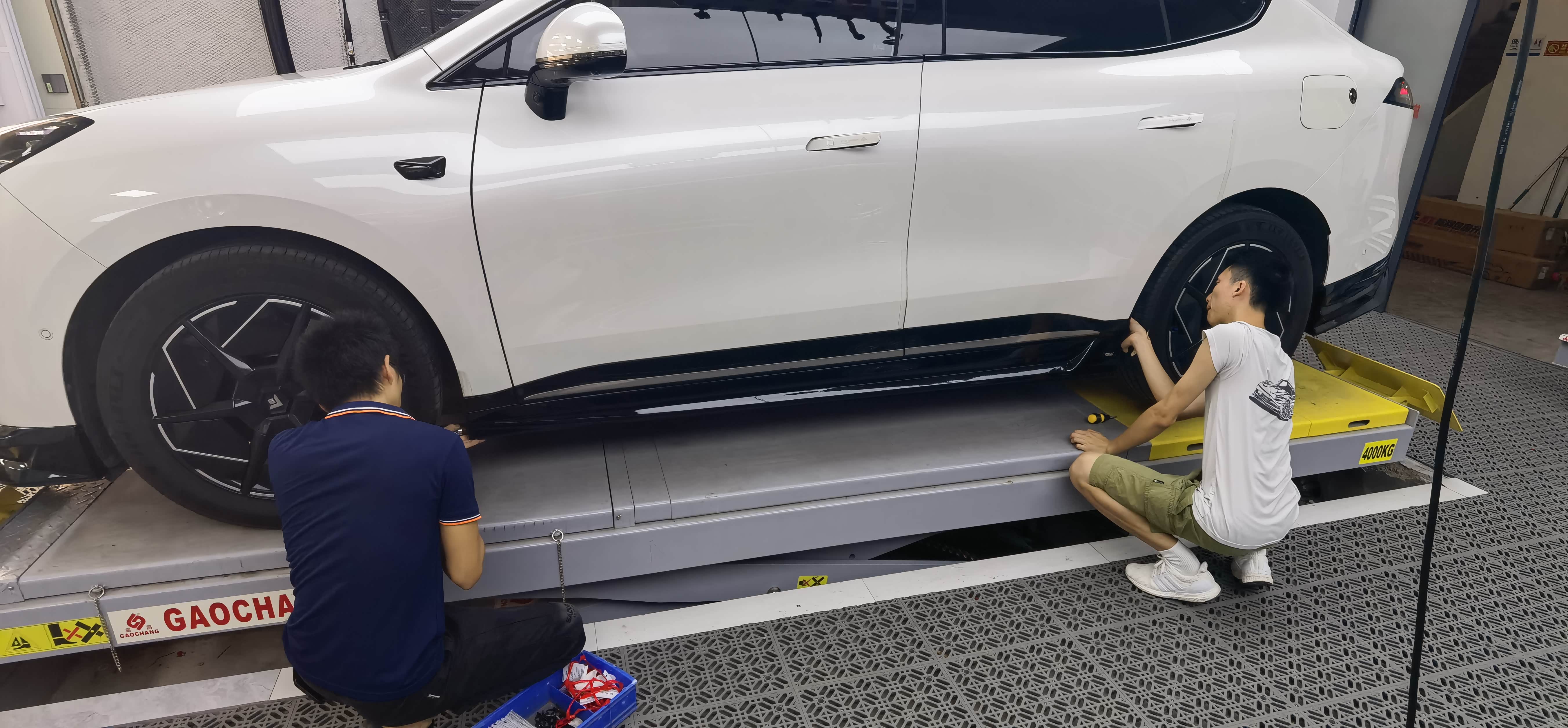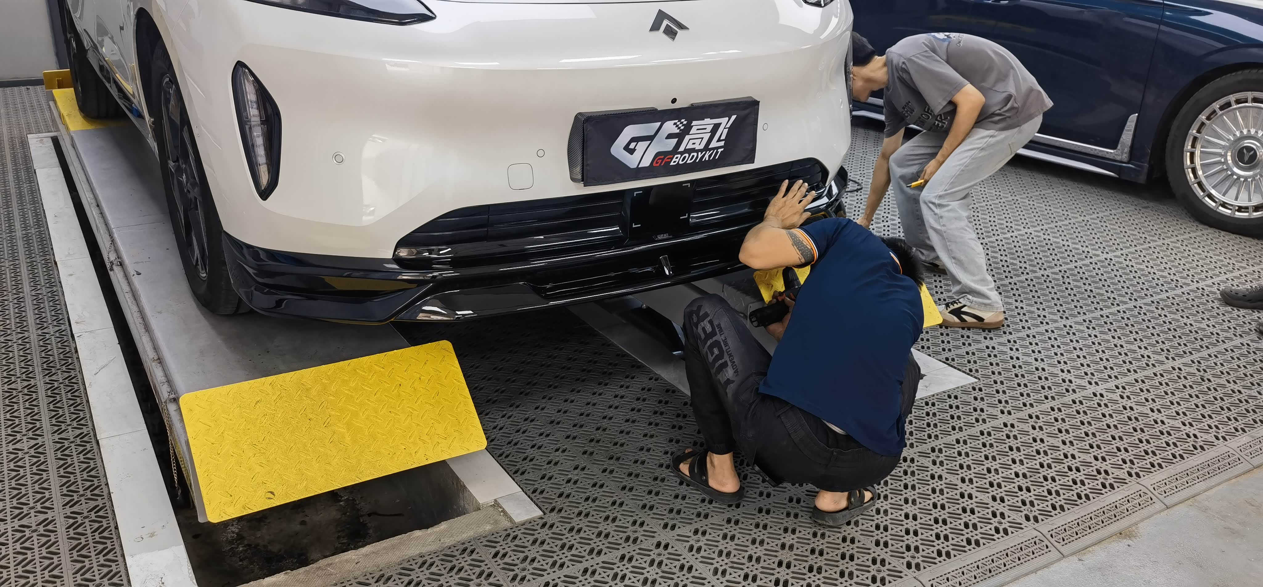 先将车辆开到举升平台,店员小哥拿着相机将原车未改装前的状态拍照记录,安装师傅到场后将车辆升起,安装包围的顺序为后杠下唇—前杠下唇—侧裙,从难到易,后杠因为要装领航灯,要拆左后尾灯接线,安装师傅三两下就解决,一看就是熟手技工。前后杠与车身接触面是用3M胶固定,在杠的下唇用罗丝钉固定。而原本最容易的侧裙则因为我加装了后轮内衬挡泥板,造成挡泥板与侧裙有干涉,需要打罗丝固定,但后轮与内衬距离短有点费劲。