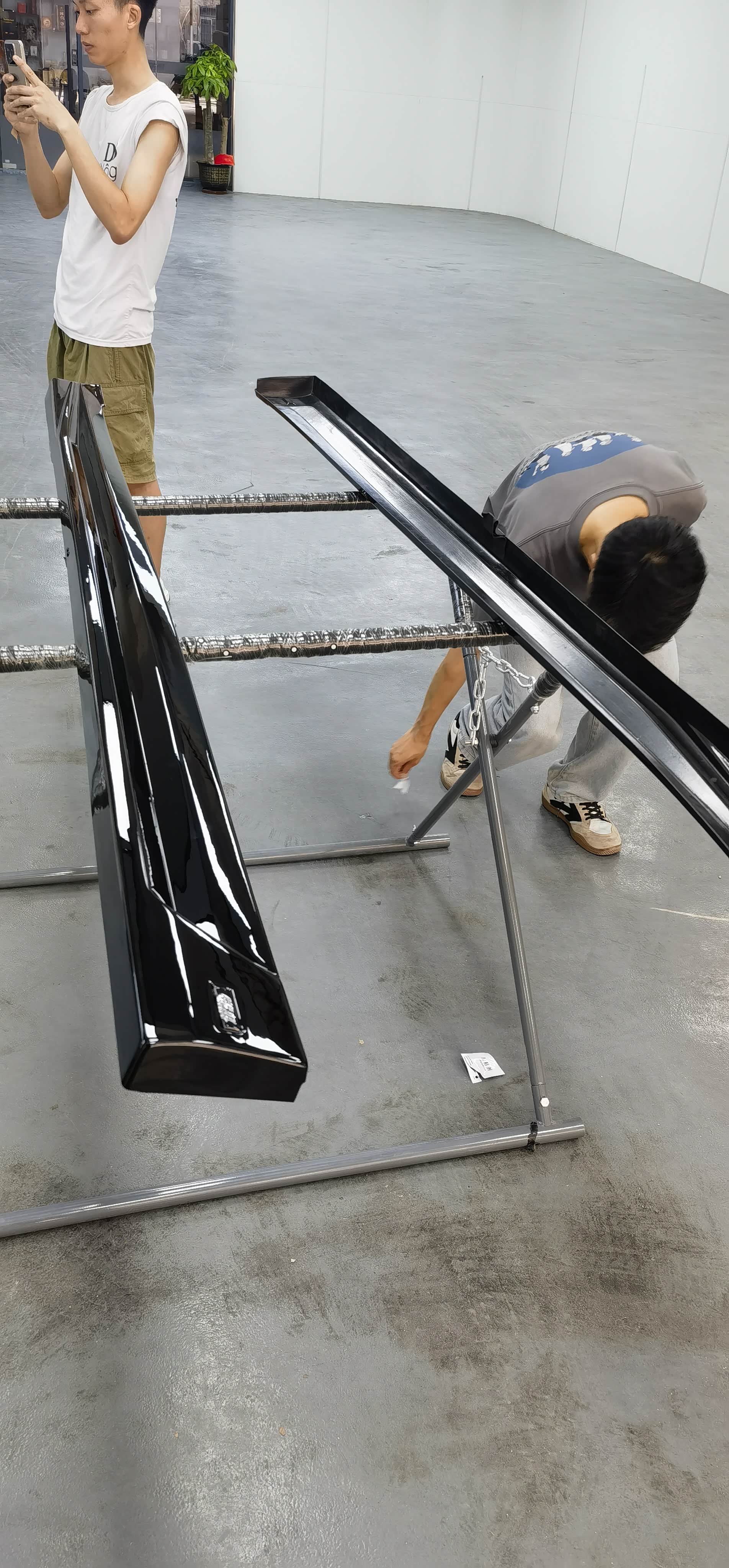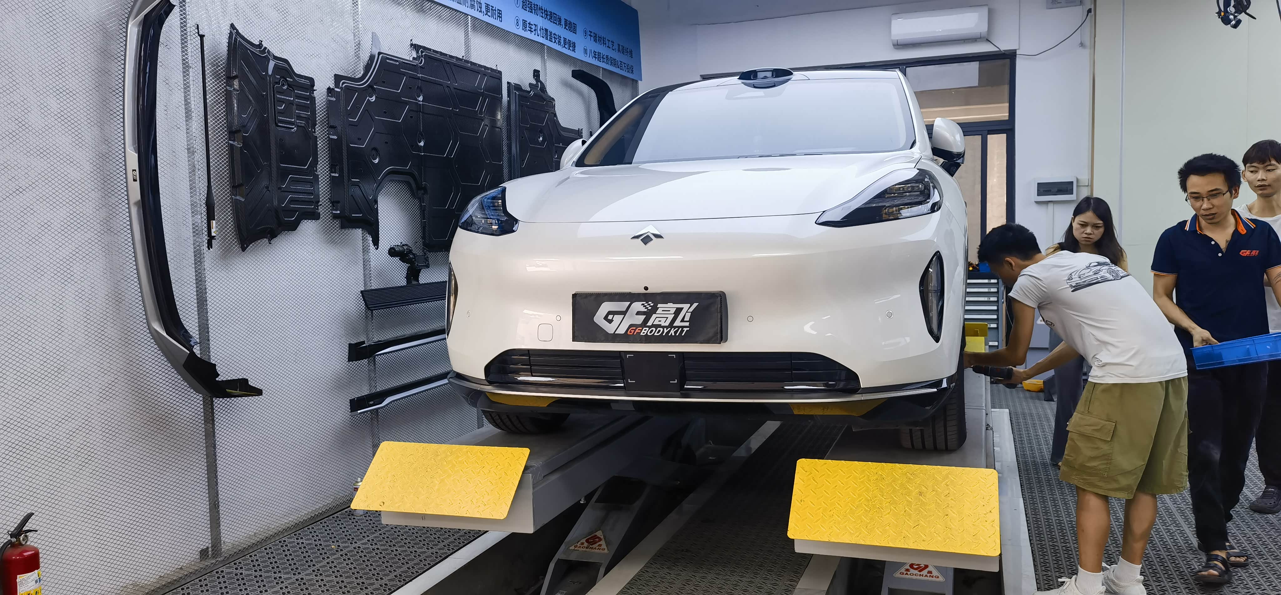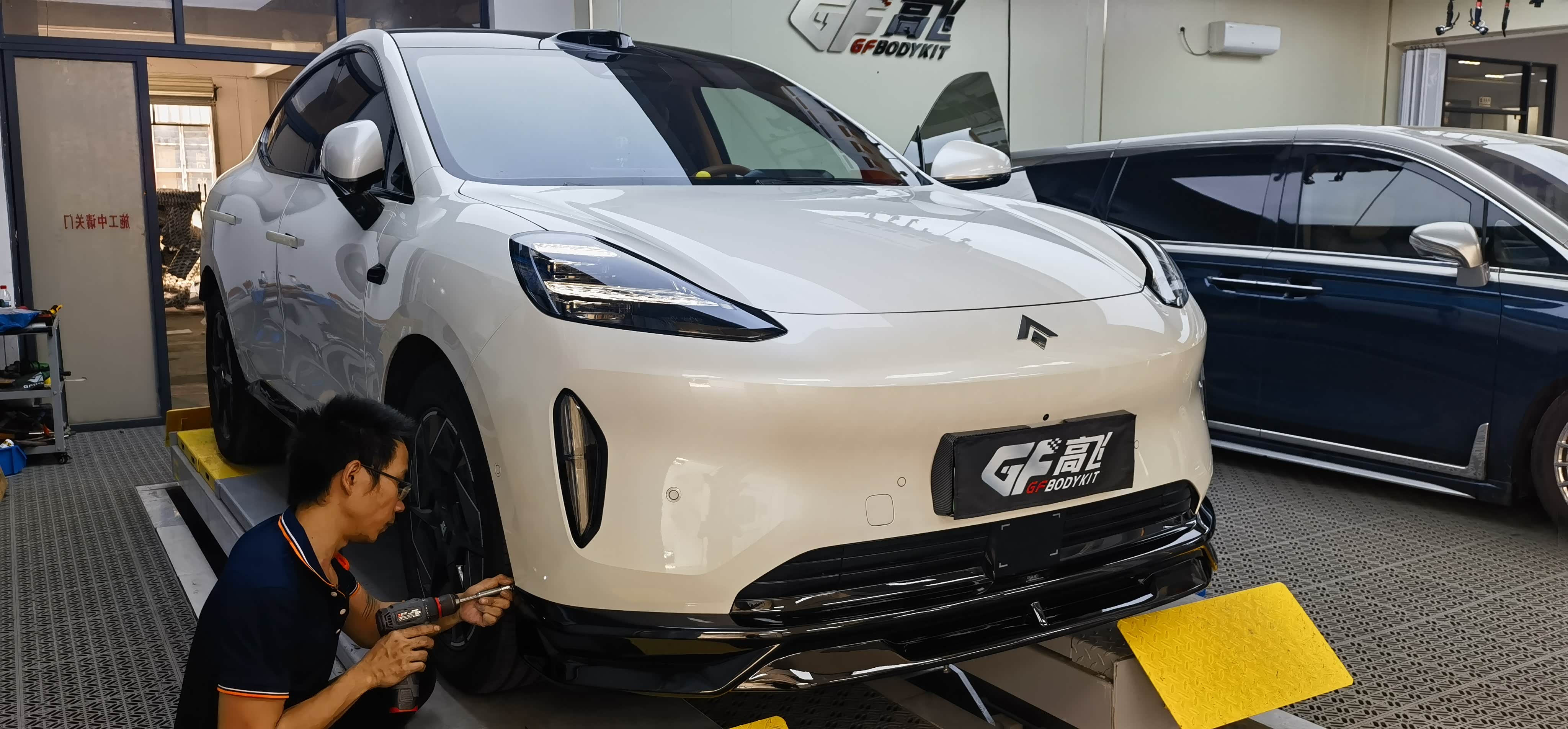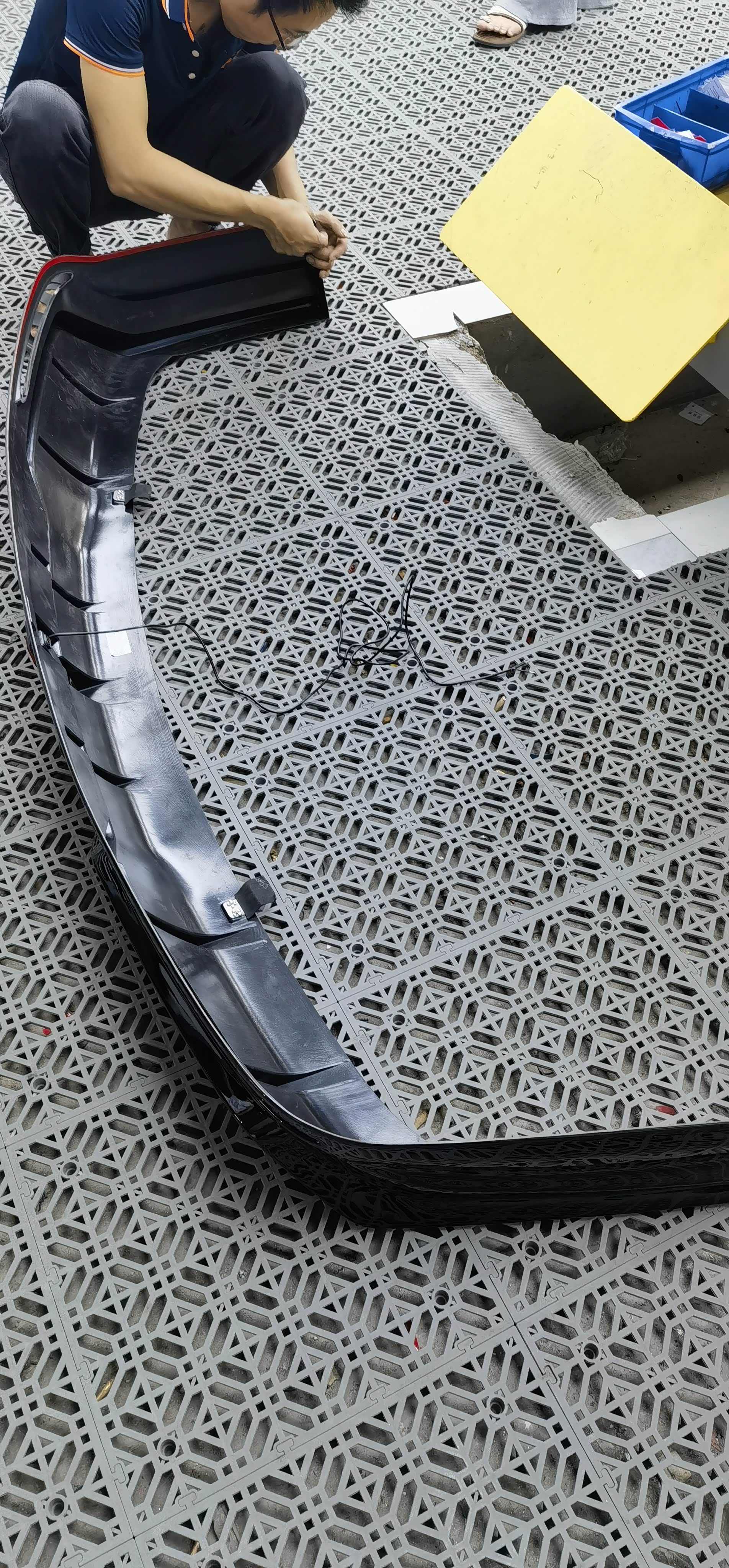 先将车辆开到举升平台,店员小哥拿着相机将原车未改装前的状态拍照记录,安装师傅到场后将车辆升起,安装包围的顺序为后杠下唇—前杠下唇—侧裙,从难到易,后杠因为要装领航灯,要拆左后尾灯接线,安装师傅三两下就解决,一看就是熟手技工。前后杠与车身接触面是用3M胶固定,在杠的下唇用罗丝钉固定。而原本最容易的侧裙则因为我加装了后轮内衬挡泥板,造成挡泥板与侧裙有干涉,需要打罗丝固定,但后轮与内衬距离短有点费劲。