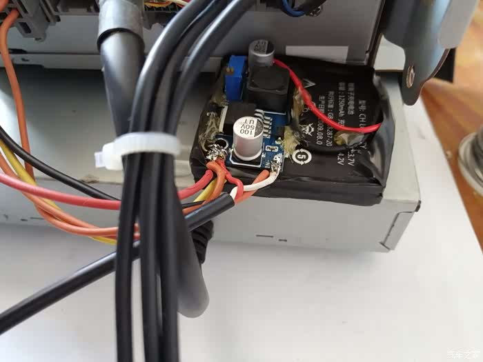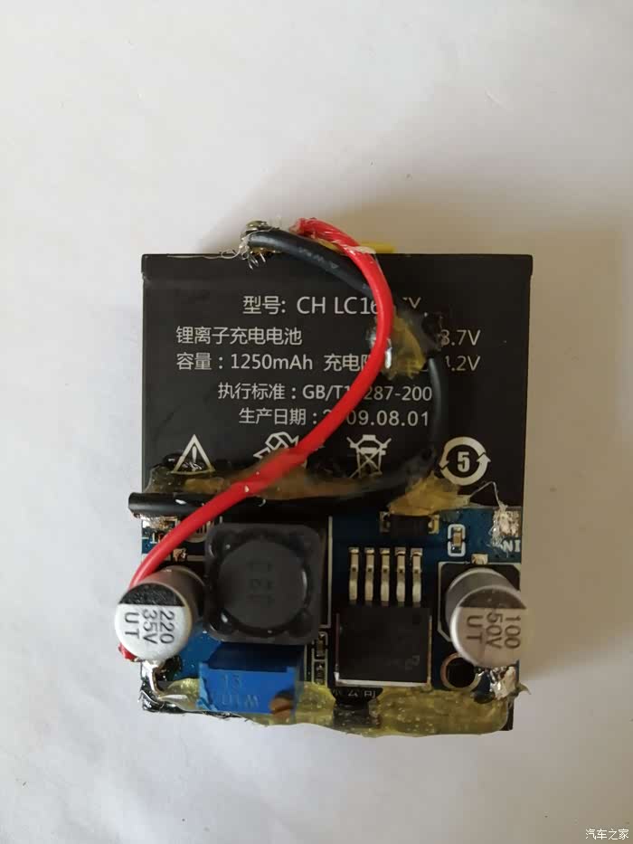 于是想到用旧手机下拆下的充电锂电池供电,因一块电池的电压只有3.6V,便用两块串联,刚好能达到要求,充电则用一块LM2596S降压模块,当开机的时候由12V电源降压至8V为电池充电,关电后由锂电池为机子供电,保存记忆。