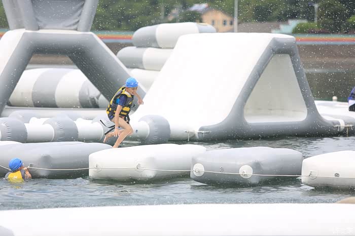 水仗完毕,切换到水上闯关环节。这是一座搭建在水上的嬉水平台,设有丰富多彩的亲水竞技游戏环节。虽然是漂浮在湖面上,但是赛道旁的水下都装有安全网,即使落水也不会发生溺水事件。欢乐向前冲,挑战大脑与四肢的瞬间反应,体力与智力的双重考验,成功了就马力全开冲往下一关,失败了扑通落水也淋漓畅快!