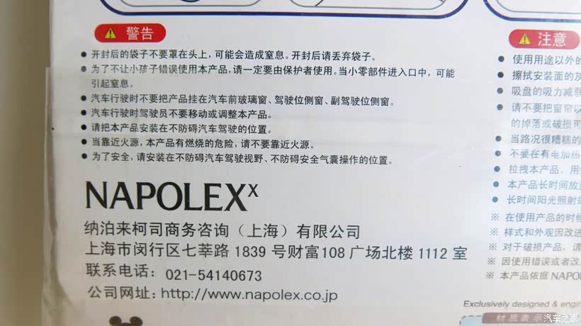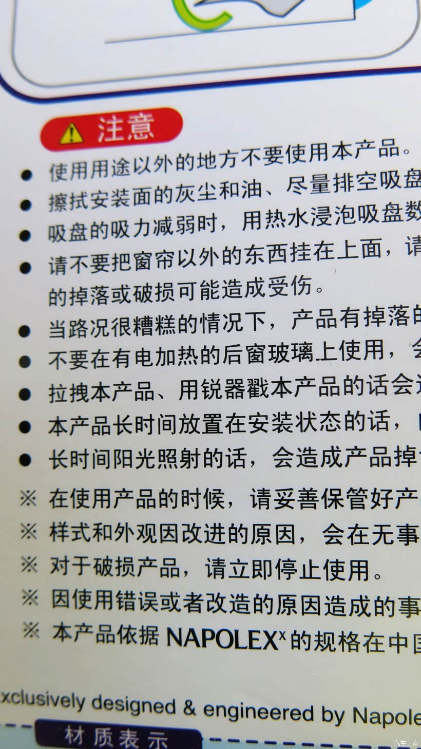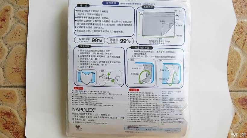 3,窗帘的包装上面就是说明书,包含的内容非常全面细致,如最生产厂家和销售厂家,安装方法,安装注意事项,而且特别强调了可能会出现危险和注意事项等等一些警示说明。特别提示了一些不正确的安装和使用方式可能会影响驾驶安全,会可能伤害儿童等等。
