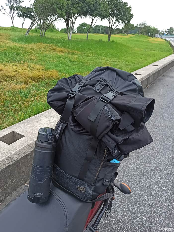 我出门喜欢带这个包,扩容能力很强,前面这两根带子能多绑很多东西。本来这几天上海温度低,特意穿了骑行服,怕路上冷,结果还是热。就脱了,绑在背包上。