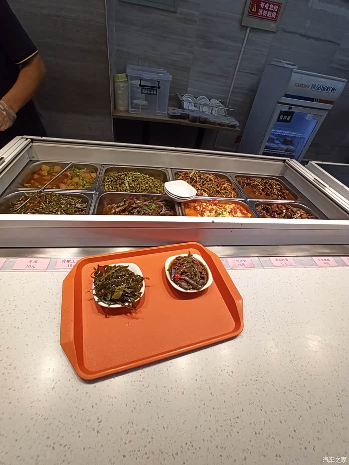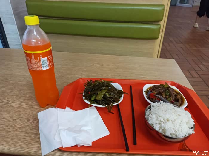 服务区吃饭,弄了两个小菜,我对吃的要求不高,喜好吃素。肉类就喜欢牛羊肉,其它都不爱吃。所以好解决。大米饭管够儿。