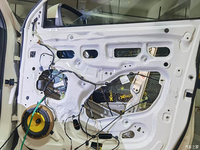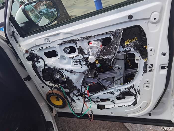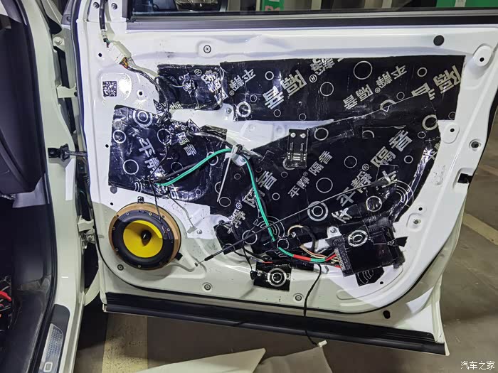 止震板封堵孔洞,只买了1张所以要裁剪,不太美观但并不影响效果,装上门板完工。