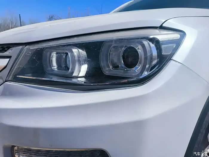 看车灯:CS75 的大灯比较漂亮,但其实远近光灯都所属卤素灯源的,中间的是带有透镜的近光灯所以炯炯有神,边上是两条像是鬓角一样的转向灯,整个大灯近看特别有气质。