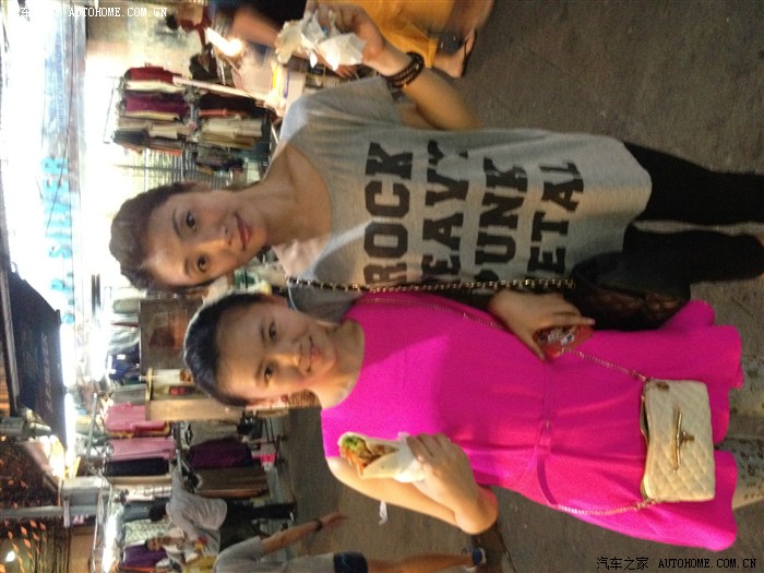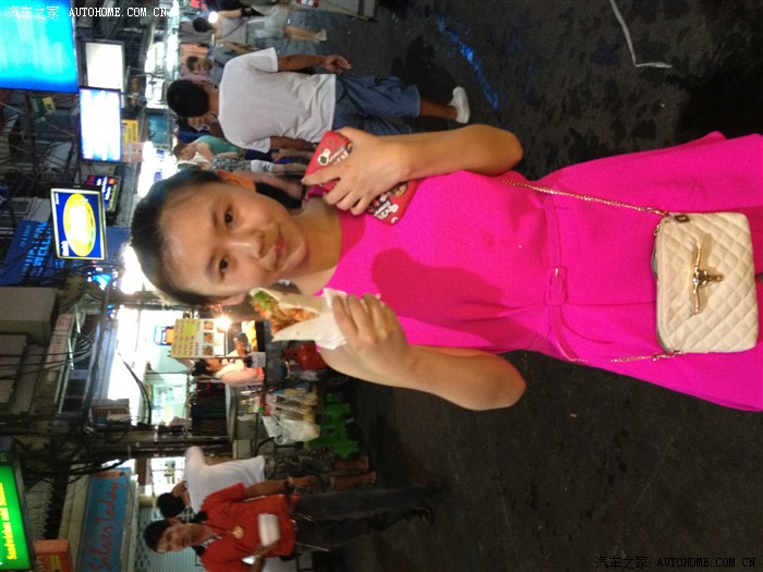 女生只顾着买东西,还没吃饭呢。一路逛一路吃吧,泰国肉夹馍来一个,味道不错!肚子饿了,吃什么都是好吃的!