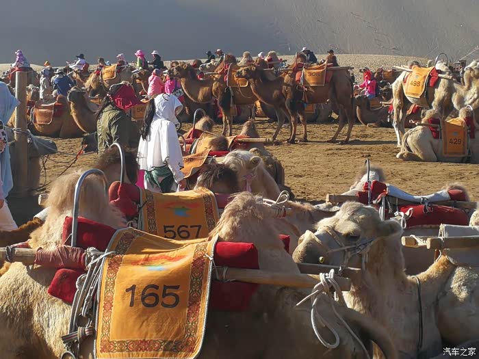 观赏鸣沙山注意点:1)鸣沙山景区门口可以租鞋套和骑付费骆驼。鞋套10元一双,骆驼160一只!骆驼很贵,如果不是第一次体验,我觉得还是靠腿走吧。2)各种单反,贵的便宜的,大炮短炮请保护好。我们还算好,去的时候前一天下过雨,风沙没吹起来。听其他去过那的人说,单反进沙了,镜头伸缩的时候有嘶嘶摩擦声音。基于以上,劝大家最好拿个保鲜袋把机器能包的地方都包起来!3)沙山看上去很高,其实还是比较好爬的。跟着前人的脚步慢慢爬,通常是往前一布,下滑半步!不过只要有恒心肯定可以登顶!4)魔术巾、帽子有时候不是用来防晒,是用来防沙的,所以必备!