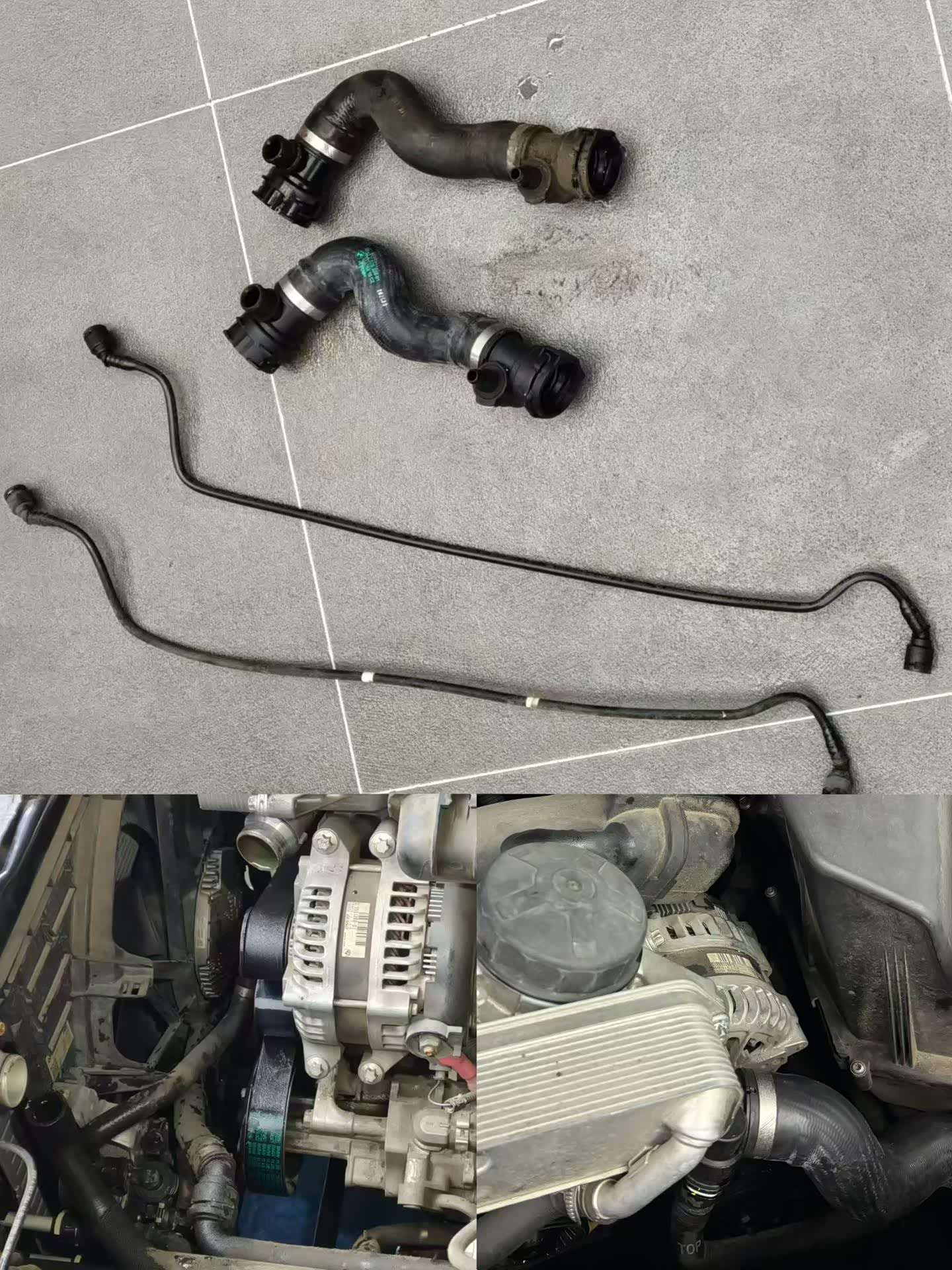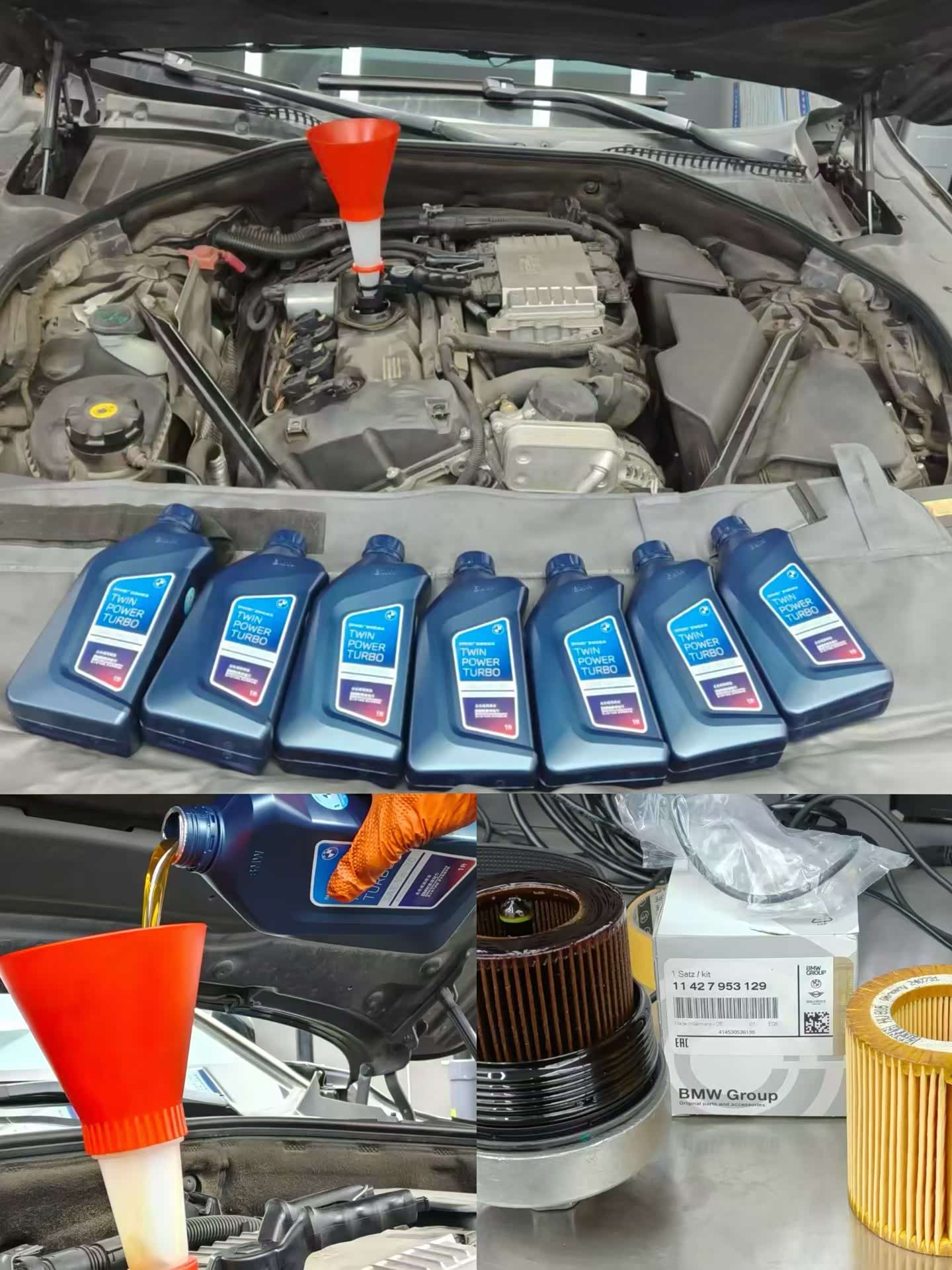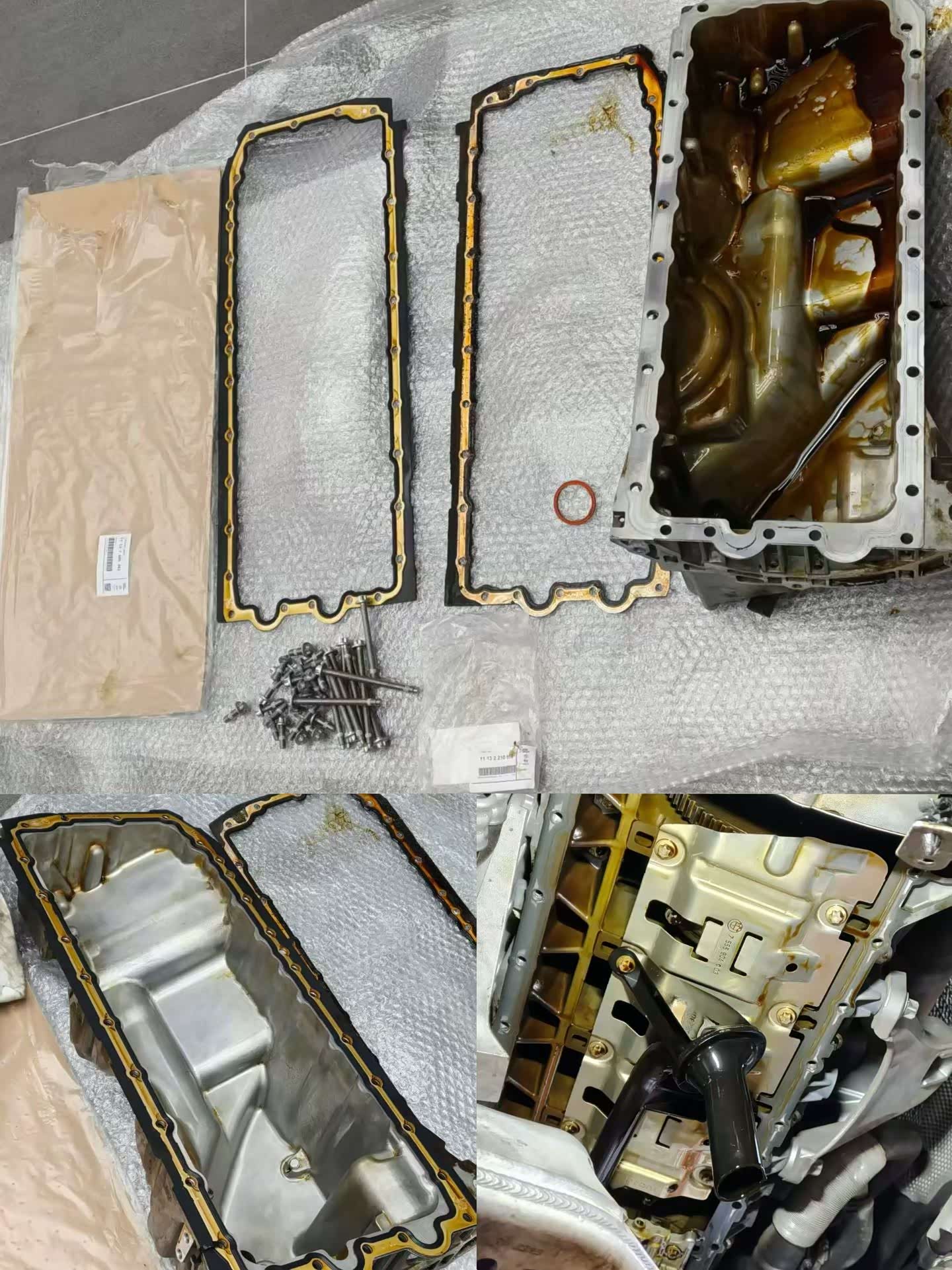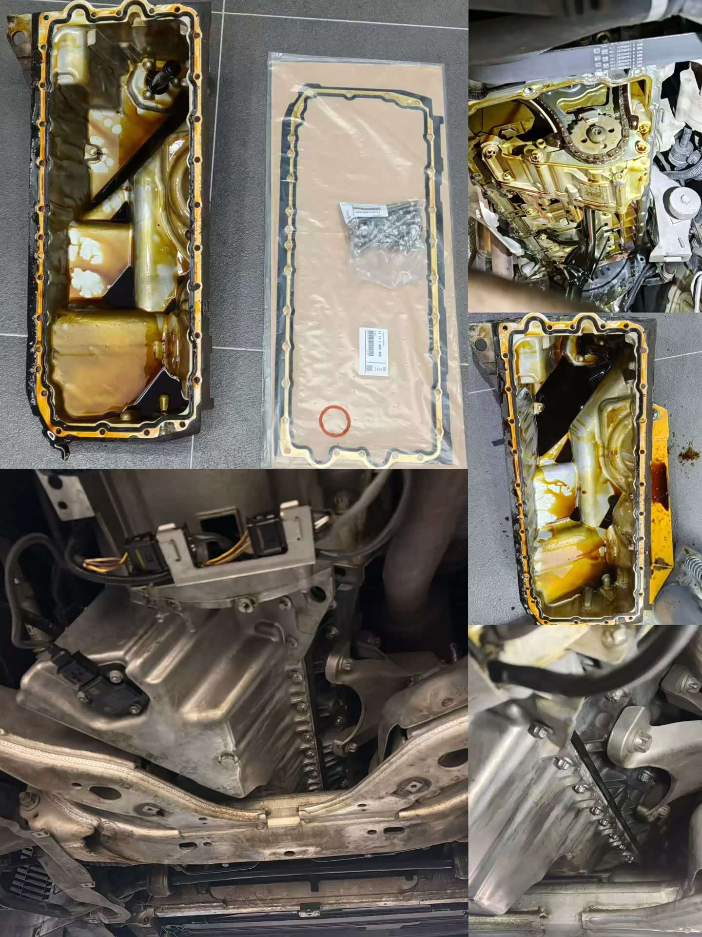客户到店,全车检查,发现发动机油底壳垫渗漏机油,发动机机脚下榻,两根水管有渗漏防冻液痕c迹,拆装前车轮,降落前桥,拆卸和安装并更新发动机油底壳垫、更新机油油位传感器垫、并更新左和右发动机机脚,更换两根冷却液水管,机油机滤保养,清洗发动机渗漏的机油和发动机下护板,检查机油量正常,CBS机油保养复位,试车没问题,送车到府