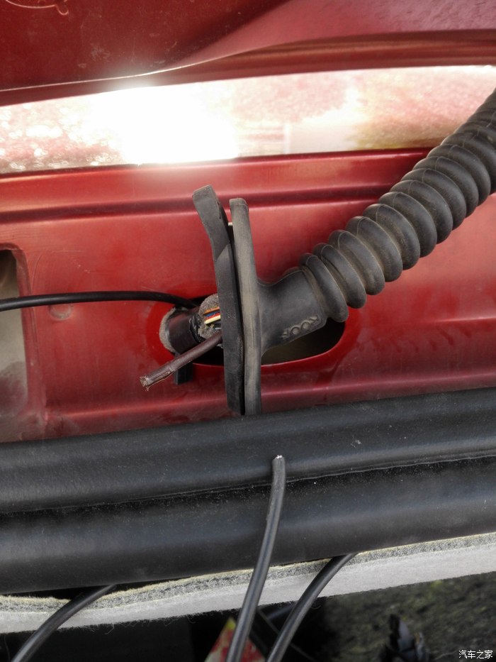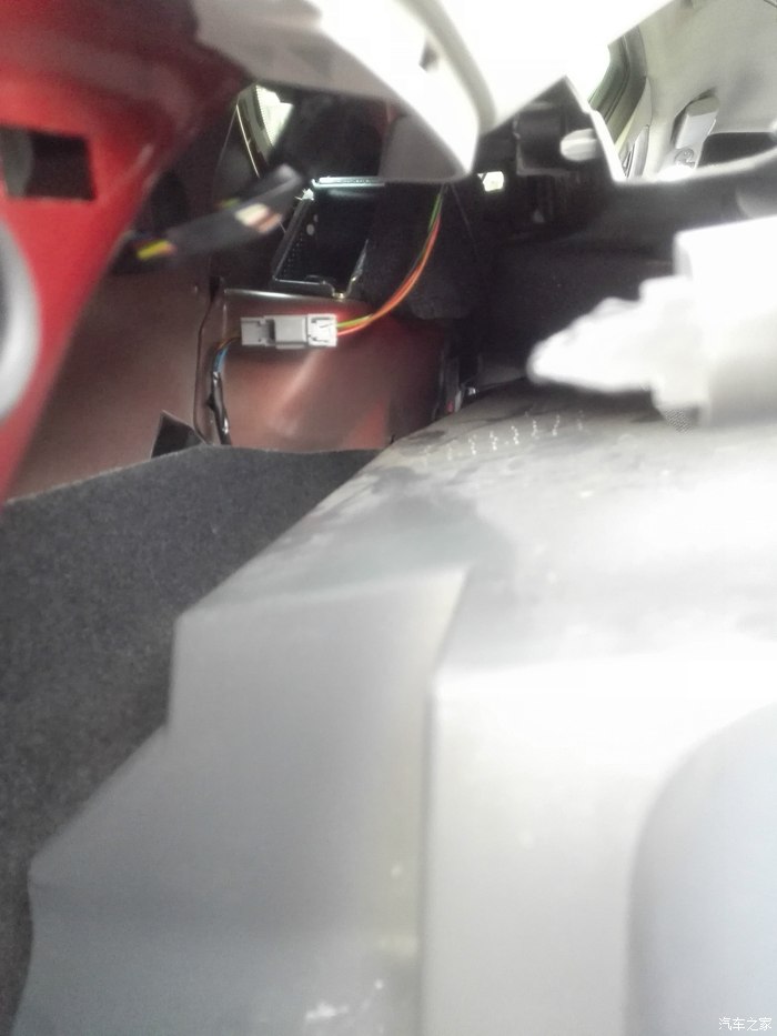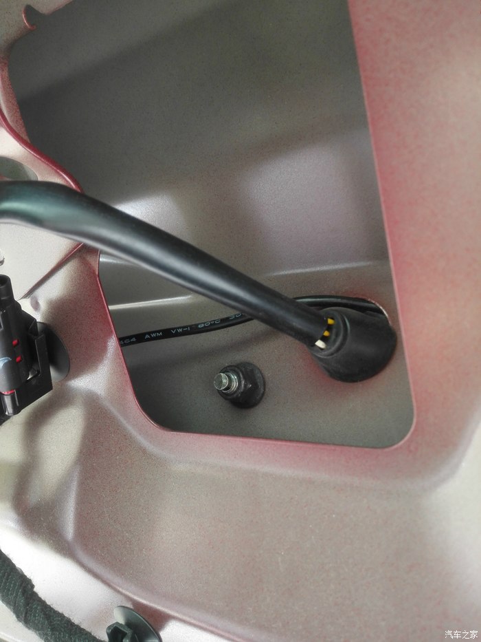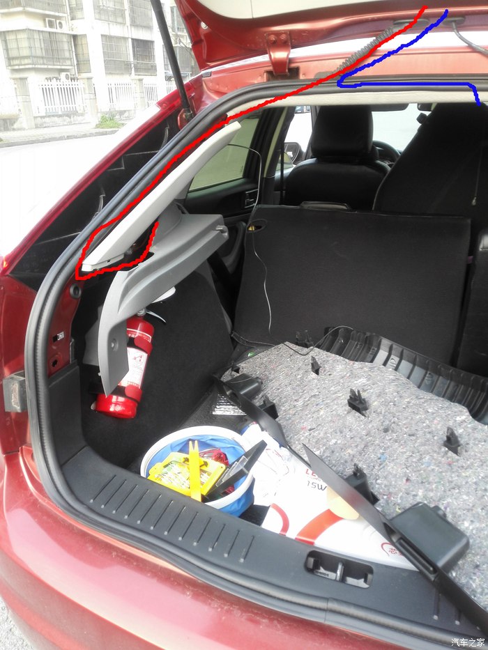 就这样一直从顶部通到后备箱里面直接进入后备箱左边的空壳子里 就这里 (如下图)然后往上面穿,因为两厢车就这点麻烦,