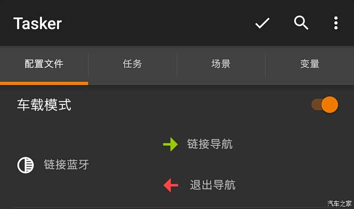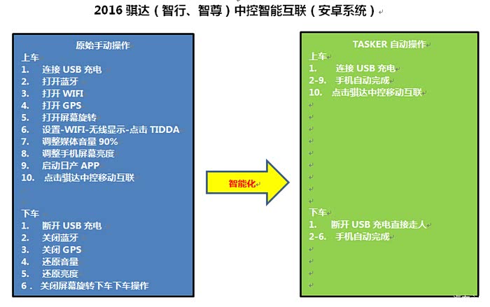 不用羡慕,我们安卓利用安卓神器TASKER应用设置也可以实现操作:上车手机插上USB充电或者手动打开手机蓝牙就可以用,下车拔掉USB直接走人。