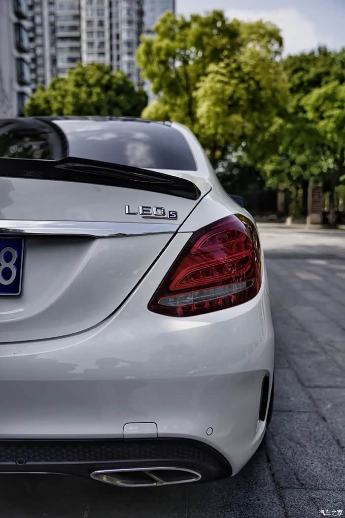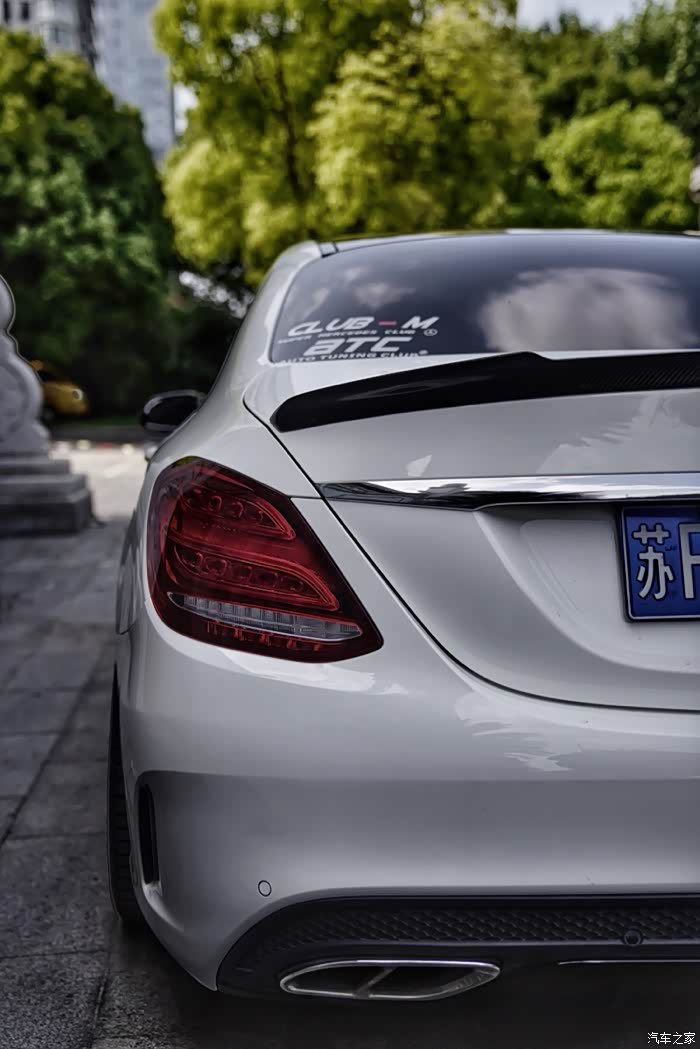 车尾部分,老款标轴本身没有尾翼,选择了fd款碳纤维尾翼,尾出部分由于没有换AMG风格,换了C43款四出(非淘宝粘贴款),安装需要些技巧,原厂卡口设计挺巧妙的。