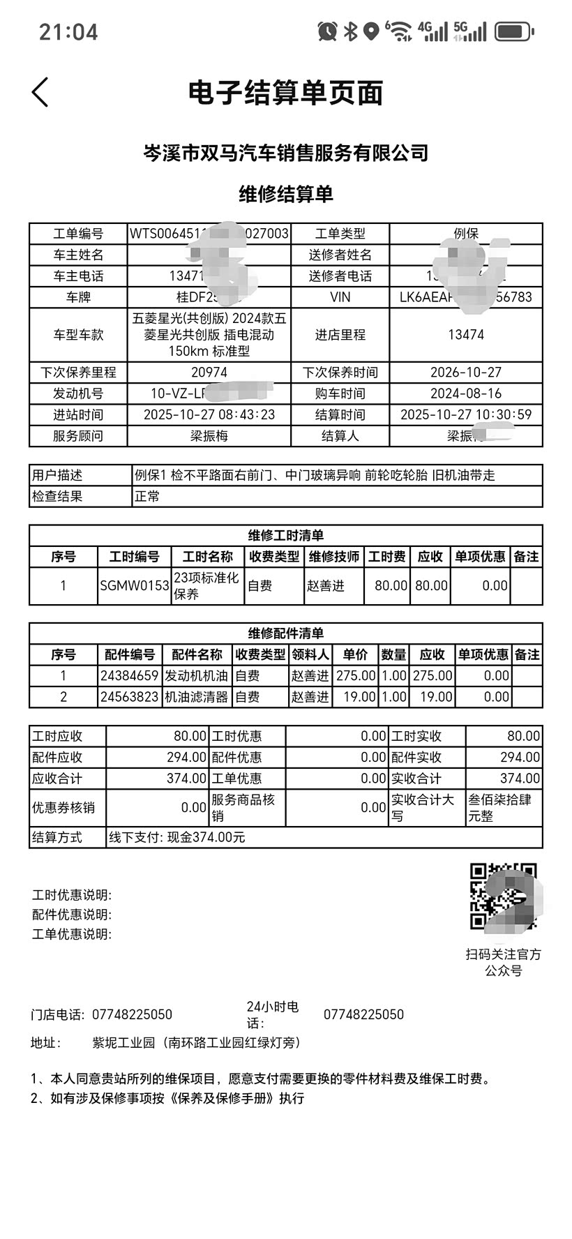 保养成本这车挺划算的。首保直接免费。就算是自费保养,二保直接在微信和五菱售后部工作人员预约又可以打折,折完后就360块左右。而且像空调滤芯、空气滤芯、雨刮这些易损件,不用非得换原厂的,买国际品牌平替能省40%成本,自己动手换还能再省点工时费,这算下来保养已经很便宜了。