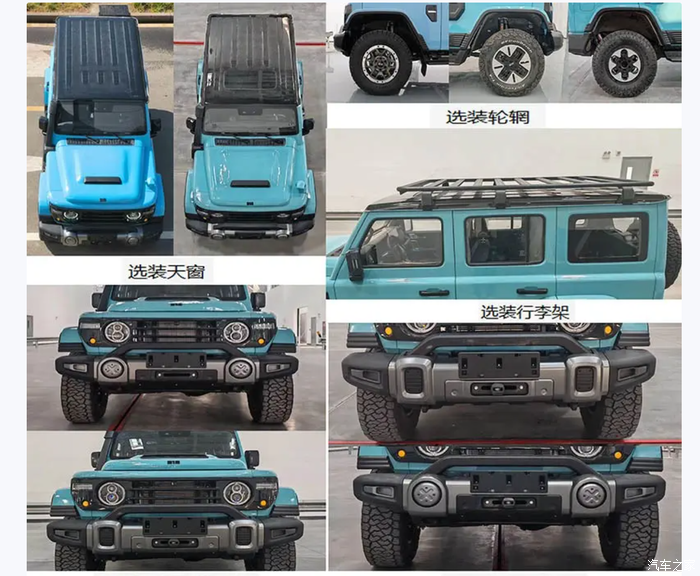 新车外观的硬派越野气息还是相当浓厚的,整体似乎借鉴了奔驰大G和Jeep牧马人的设计风格,力量感相当卓著;新车或将提供普通版和运动版两款造型,前脸进气格栅采用三横幅式造型,分体式圆形大灯组内部又呈现出大小圆形纵置排列的灯源结构,下方包围结构更是采用了大尺寸凸出的运动扩展加持,强化了新车的越野属性。而运动版车型则融入了更多的运动套件,包括中网黑色护板、银色保险杠套件、引擎盖散热口以及矗立在A柱的涉水喉等。车身的前后轮眉均进行了向外的扩展延伸,车顶边缘映射出了向外的帽檐卷边造型,配备了熏黑色的后视镜和传统式门把手,还有固定式迎宾踏板和六幅式轮辋造型等。新车长宽高尺寸分别为4705x1895x1936(2070)mm,轴距为2860mm。