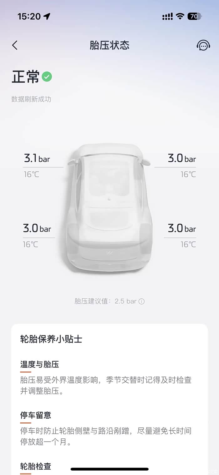 这个功能终于终于是上线了,以前只在车端有提示,他这个提示还有延迟,冷了我一大把,早上起来开车去上班走出小区在路上才提示我胎压过低,下车一看都瘪了,措手不及。现在总算能提前在app上查看了。