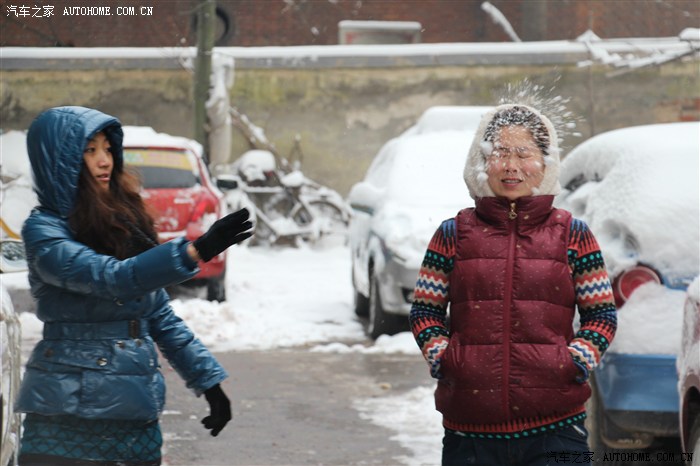 我们和我姐还有邻居在楼下打雪仗。好玩。