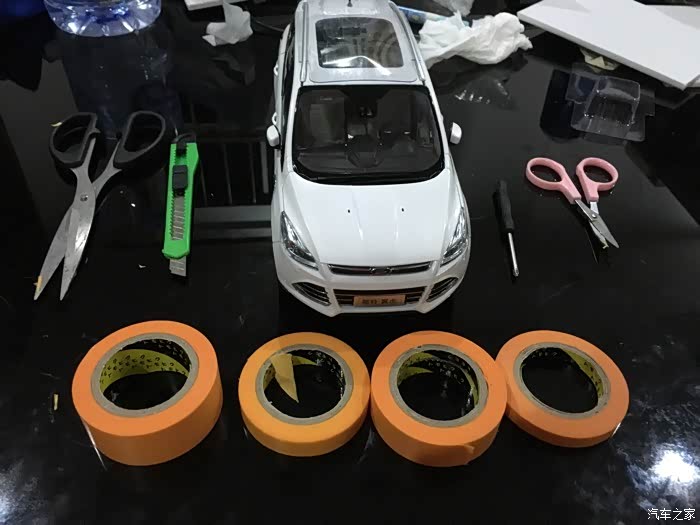 材料准备:美工刀,剪刀,螺丝刀,遮盖带,车模一部。