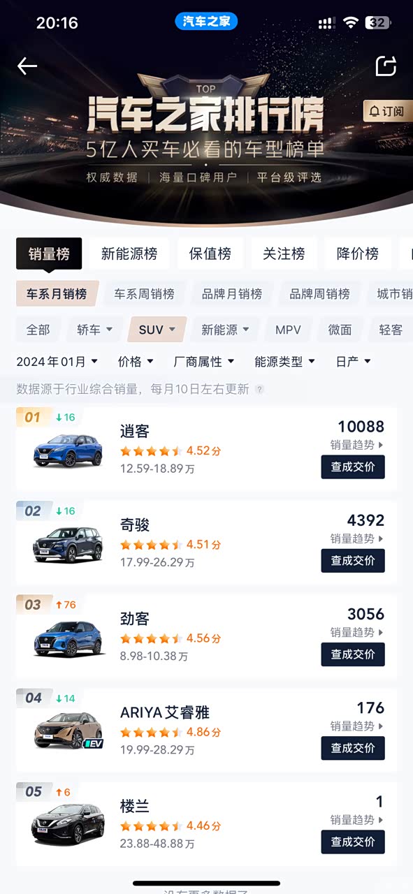 这只是日产品牌中SUV车型的24年1月销量情况。