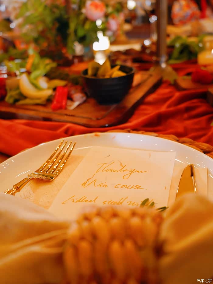 体力消耗的一天,肚子早就饿得咕咕叫。营地内的餐桌被布置成北美复古风情,摆盘精致的食物在烛光下更加诱人,谁看了不得垂涎三尺?