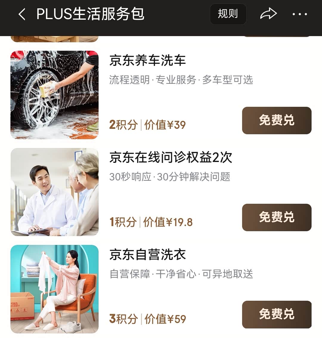 购买保险时赠送的6次洗车服务尚未用完。我洗车比较佛系,路过洗车店没有排队时才会去洗,其他时候则顺其自然,只要我看得过去就继续开。最近我发现了一个免费洗车的渠道,分享给大家:某东plus会员里有个生活服务包,今年开始派发12积分,里面有京东洗车服务可以免费兑换(我的积分快到期了还没用过)。除了洗车,还有寄快递、保洁、洗衣、体检等服务可免费兑换,有兴趣的车友可以了解一下。