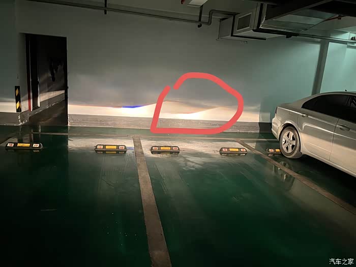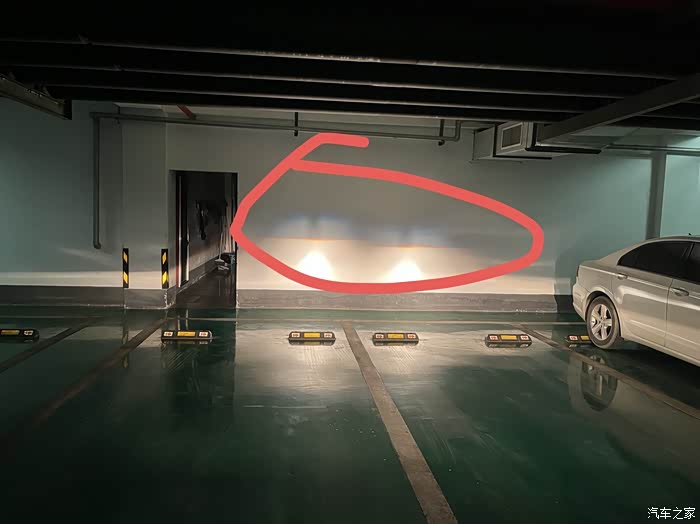 有可能是你距离太近,照在墙上反射回来的灯光。你在夜深人静的小路上,把灯开开,坐在车里再看,是不是会舒服一点。