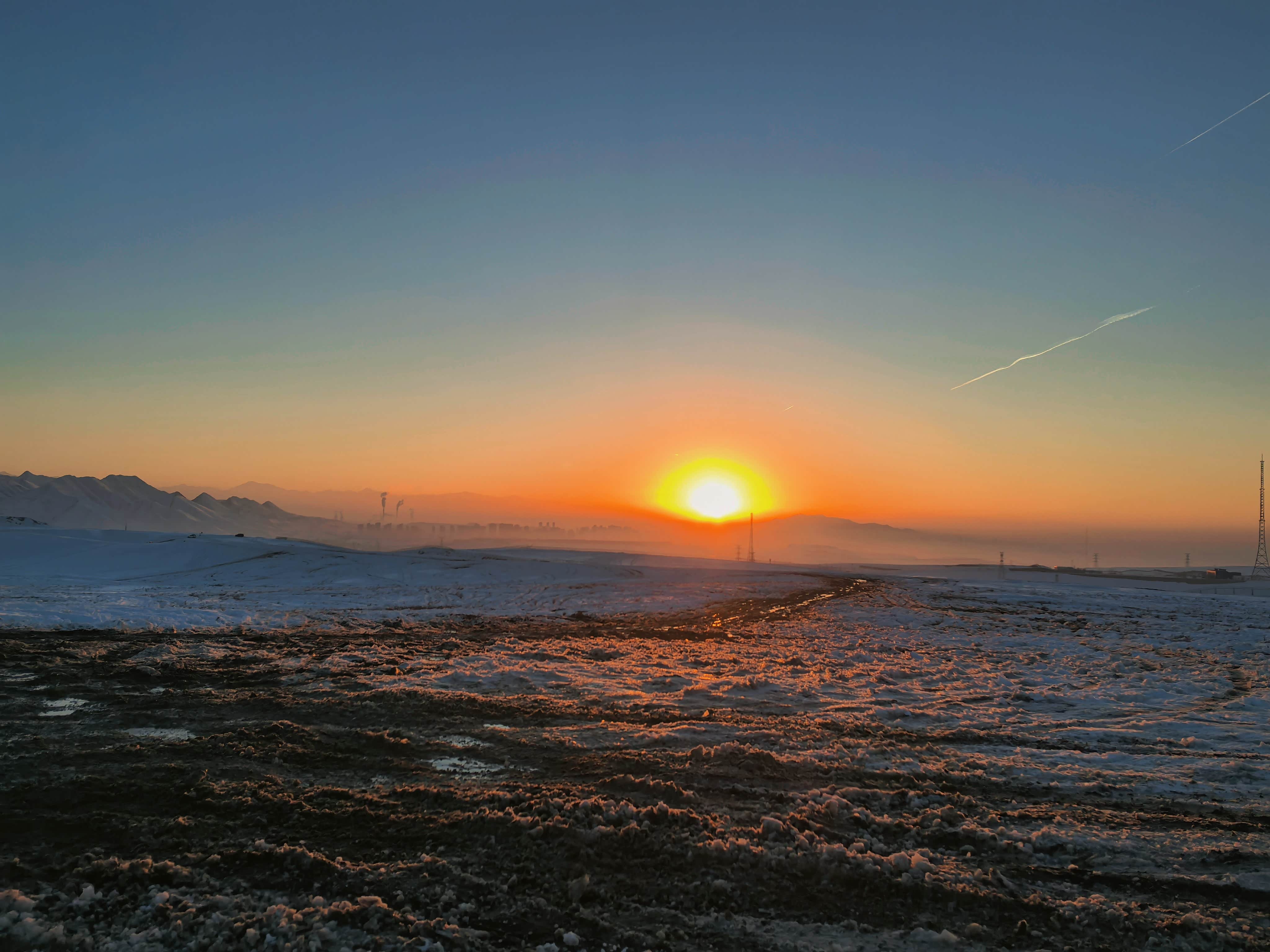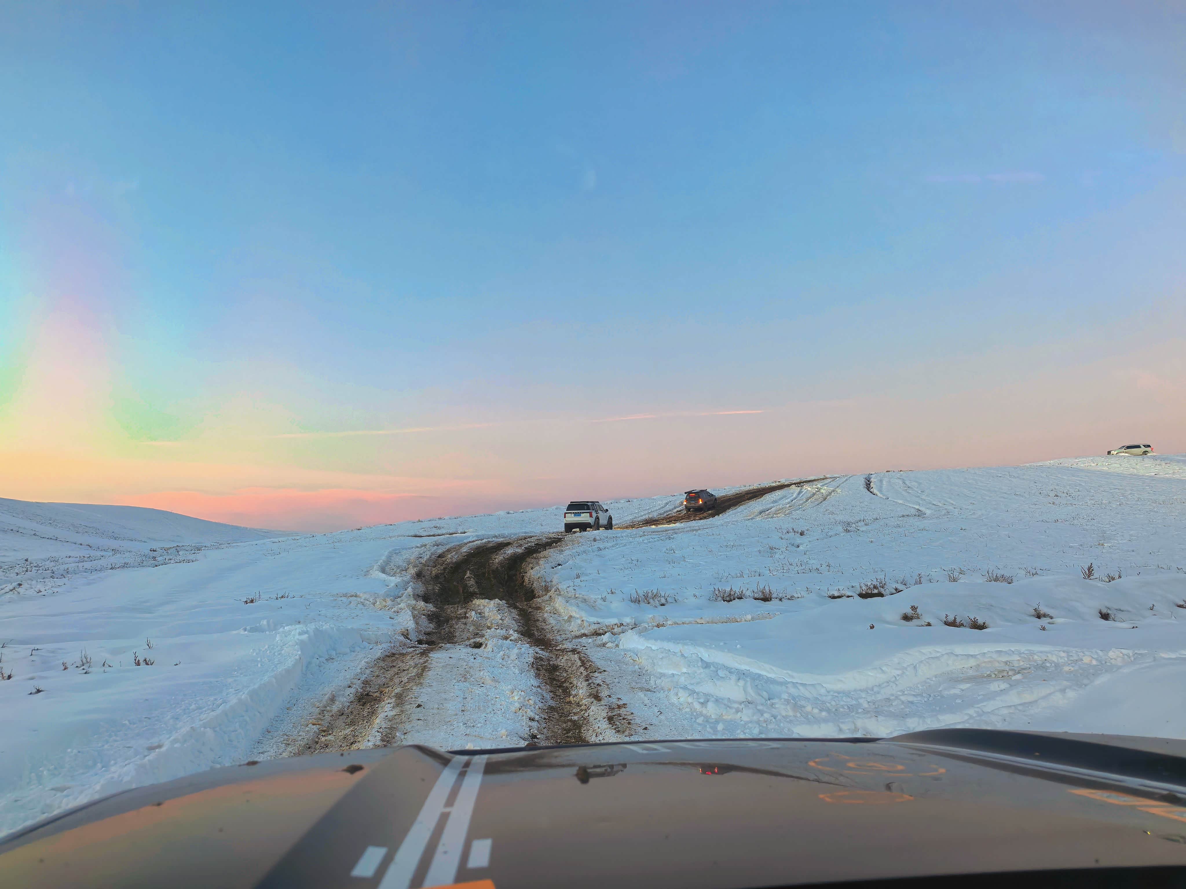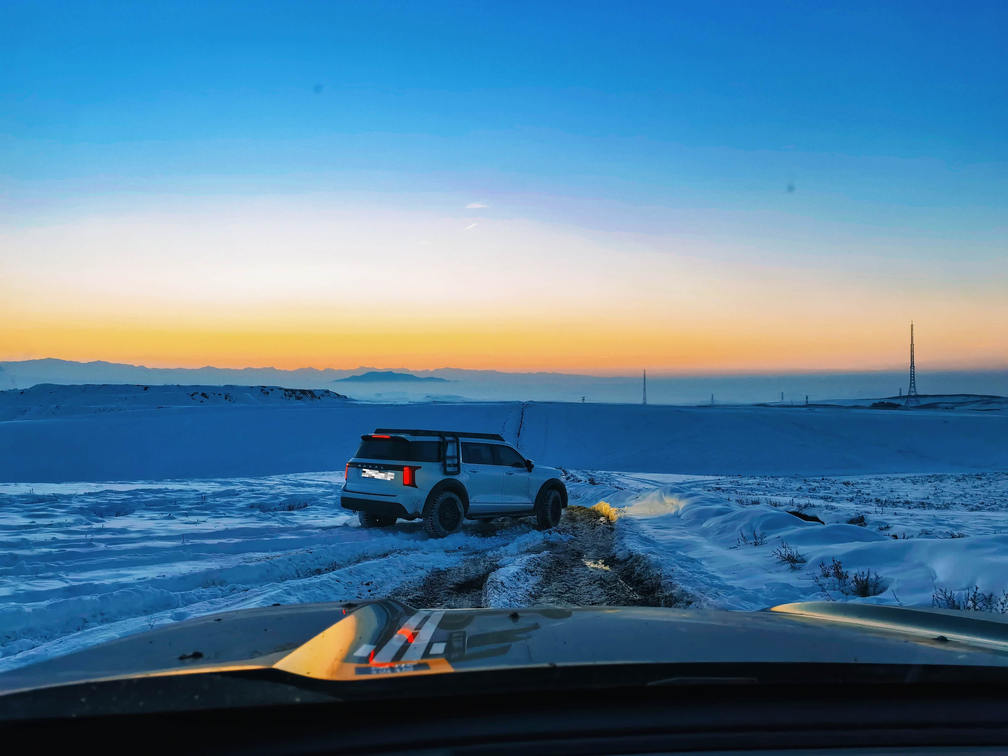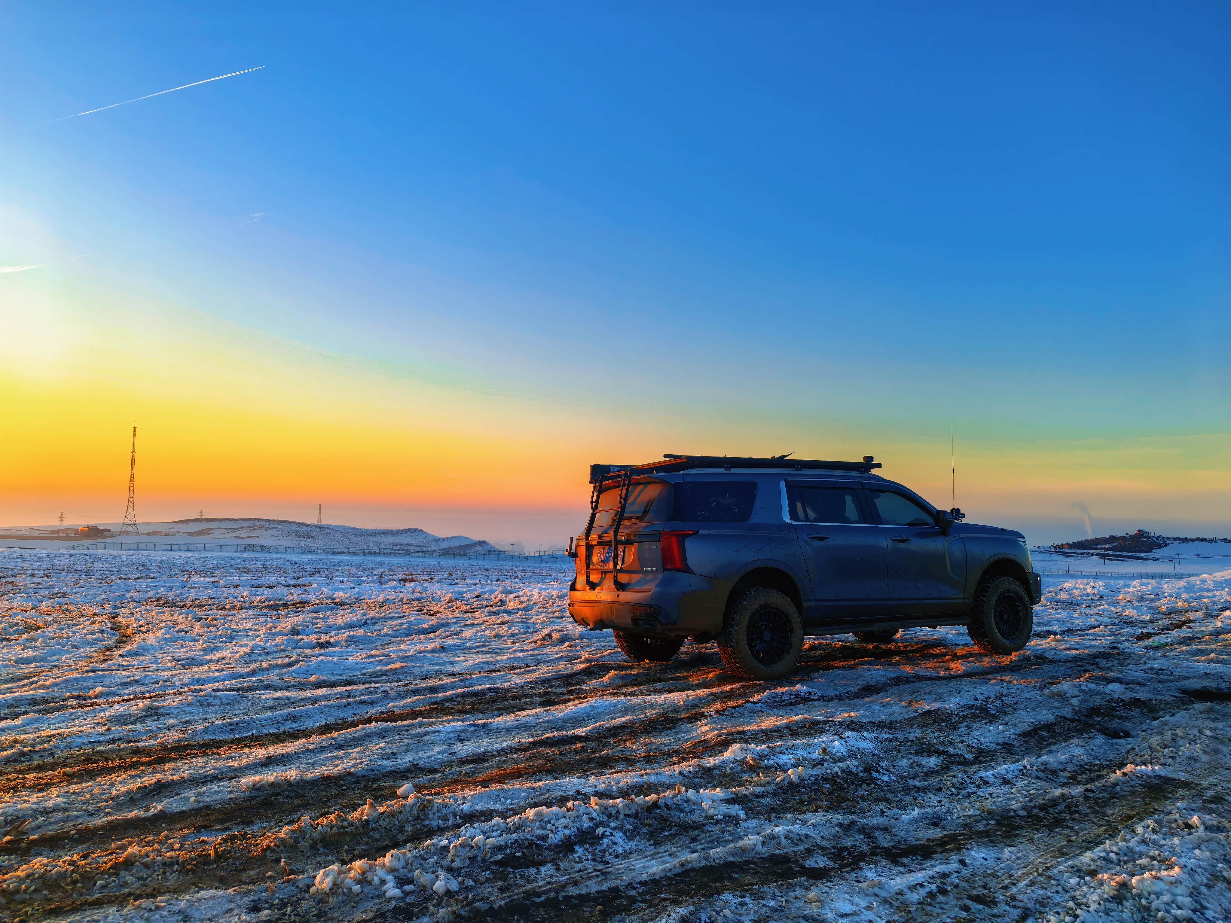 终于冲上山顶,整片牧场安静地躺在夕阳下。除了我们的车辙,雪地洁白无瑕。落日把一切都镀成金色,连呼吸都带着浪漫的味道。