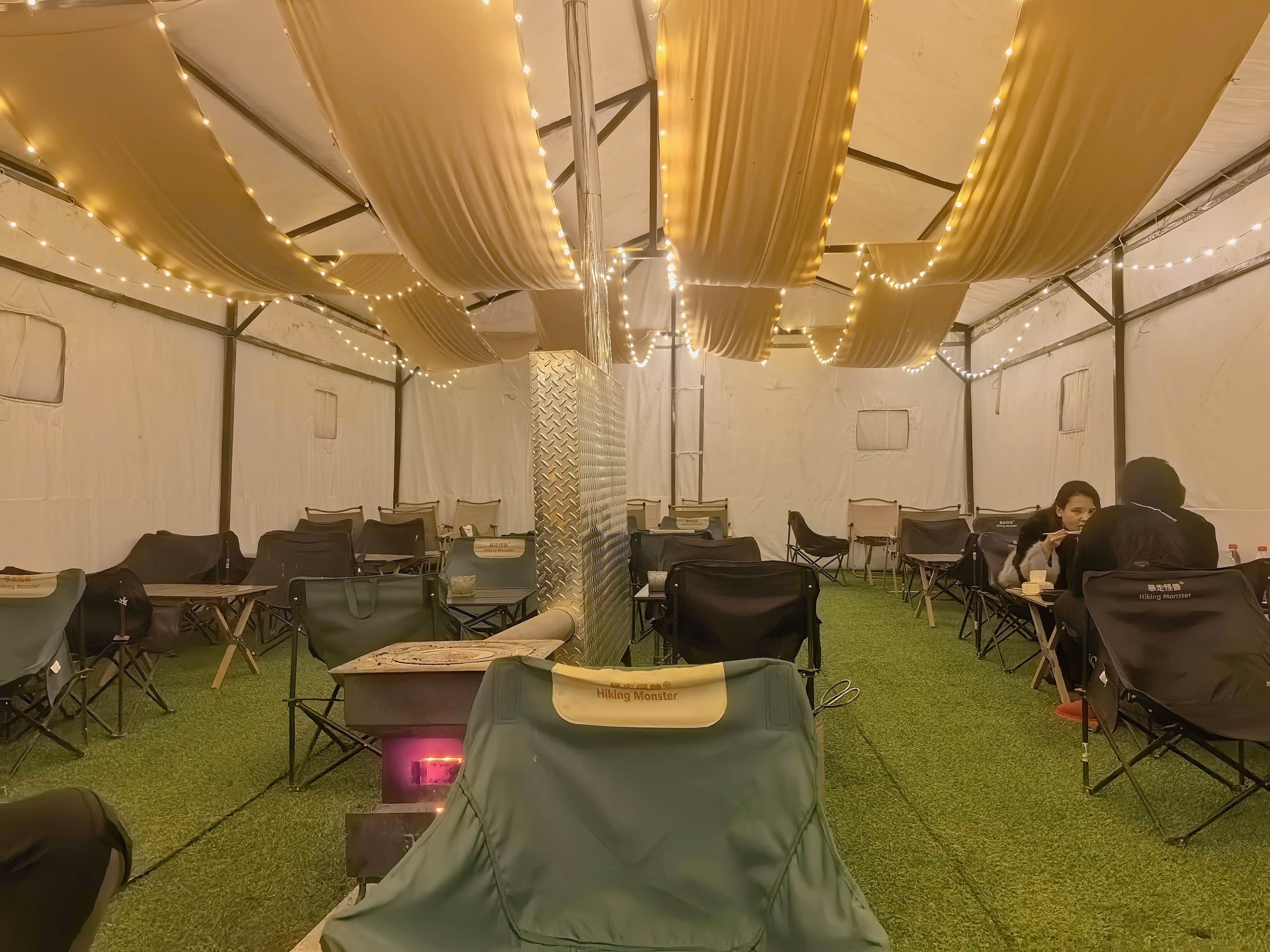 点上柃檬水、冰美式,再烤几个串大家围着火炉侃大山。