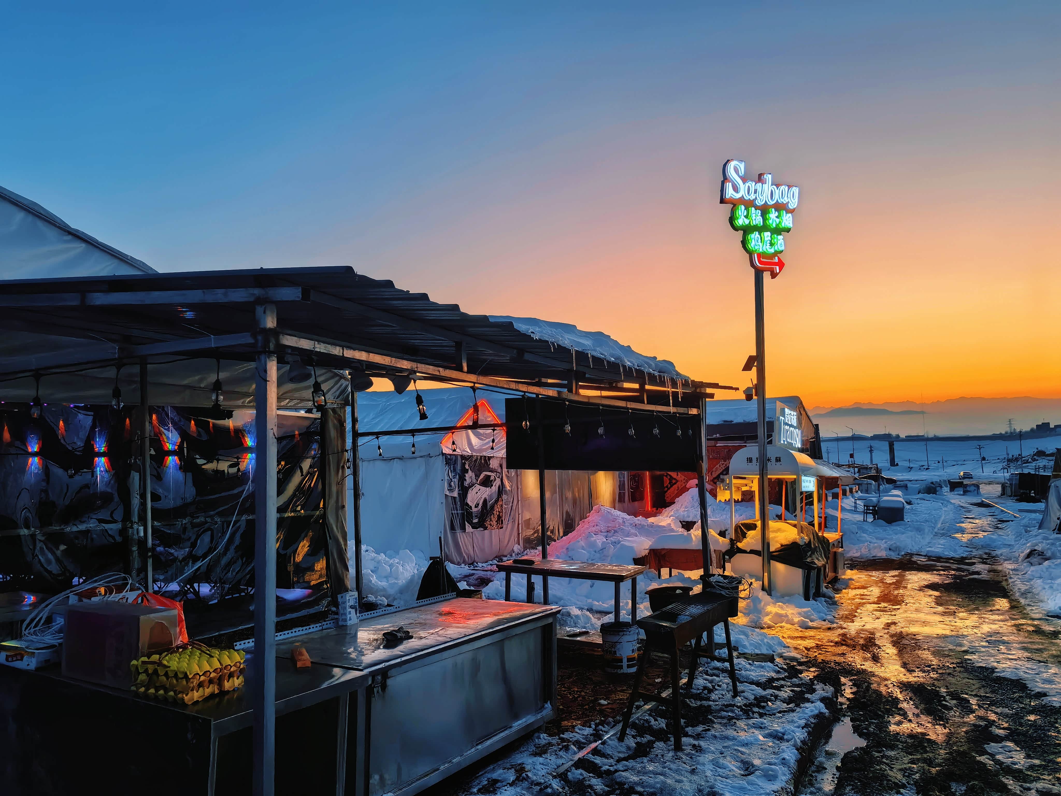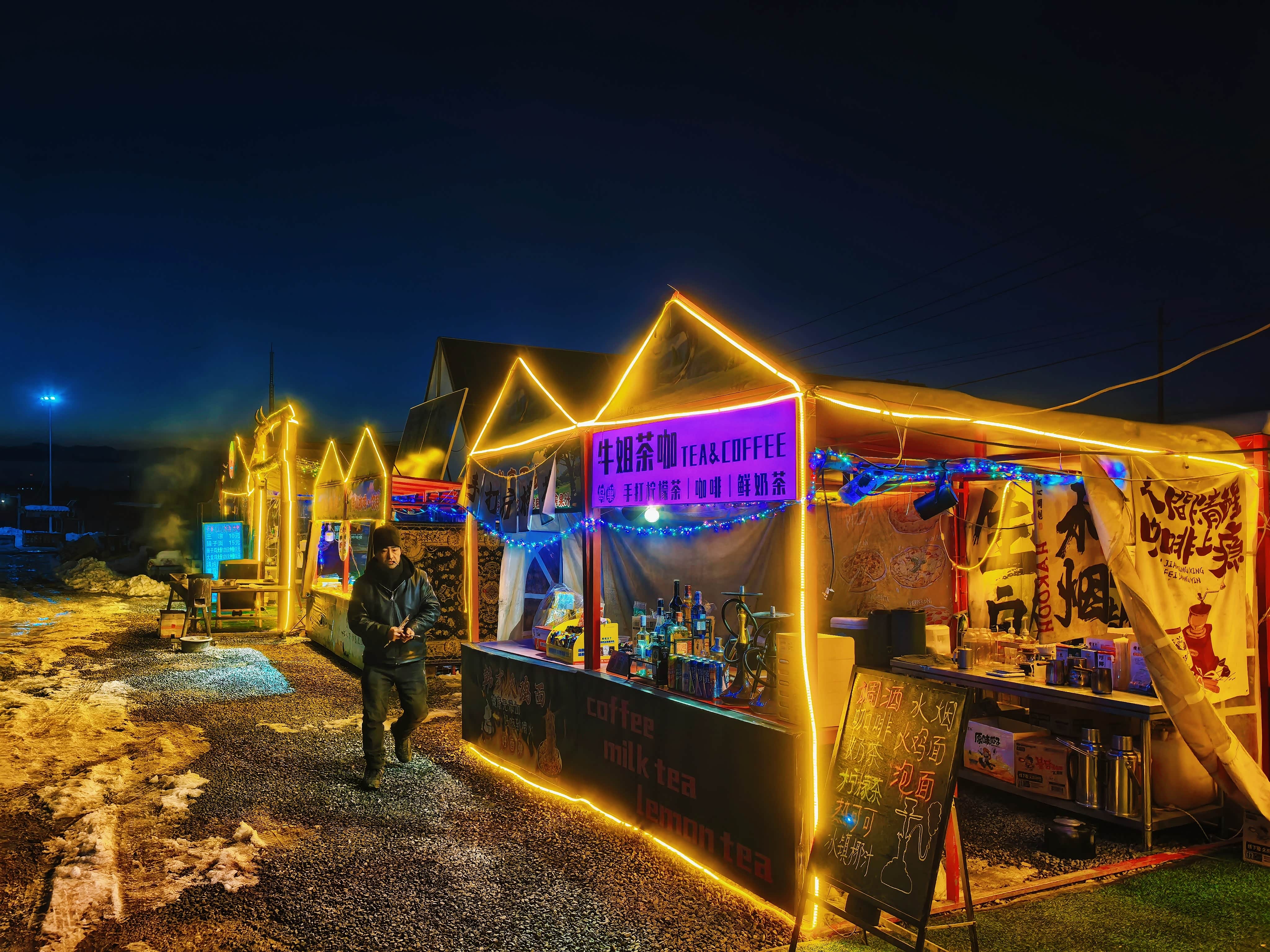 浩浩荡荡又来了六个车友,帐篷里暖烘烘的,羊肉串的香气混着咖啡的醇厚。