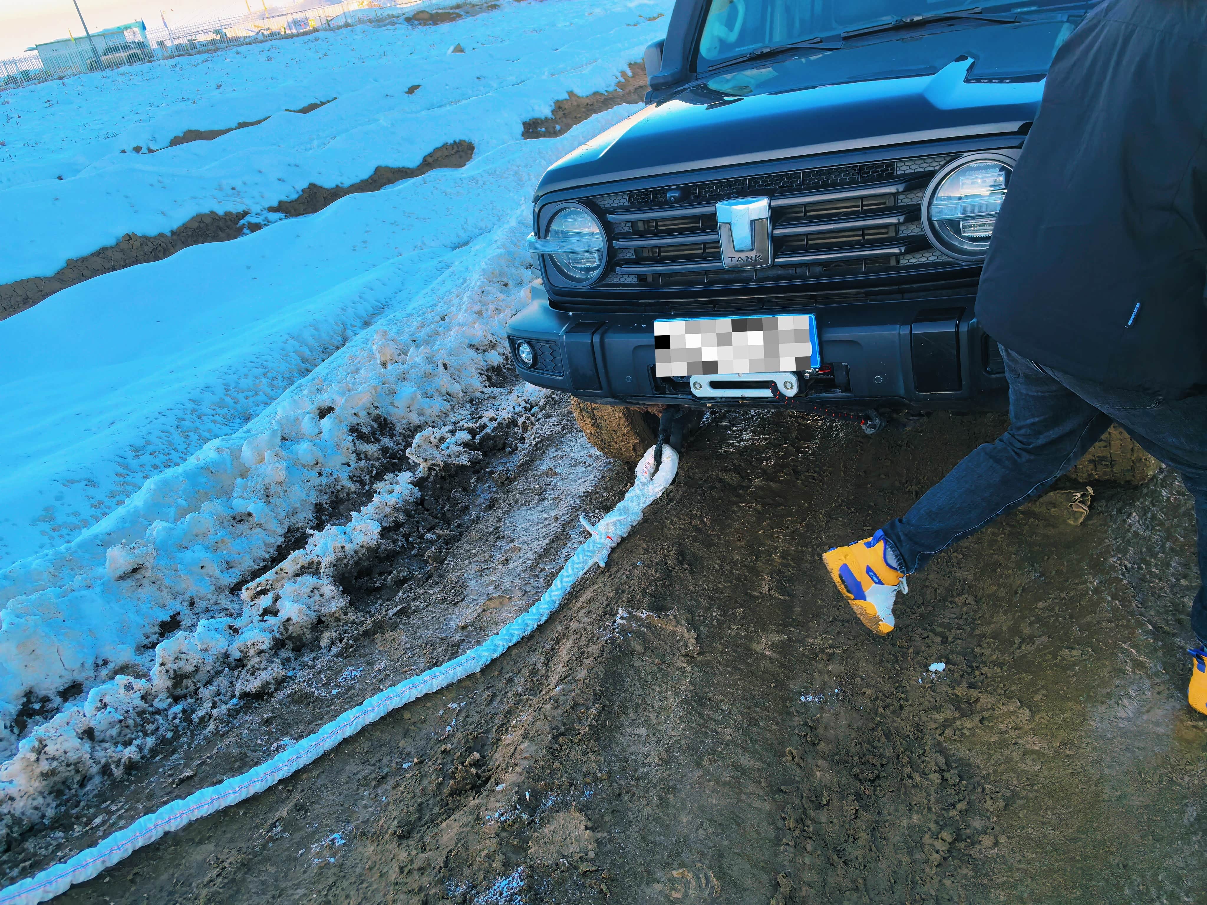 没想到,大队人马还没到,先来了一辆坦克300直接停我后面滴我,我摇下车窗问大哥去哪玩,大哥说:“我来拉你的,嘿嘿?”我解释队友马上来。他笑了:“我就是你队友摇的人。”得,这下不拉都不好意思了。从后备箱翻出拖车绳(幸好没因为跑空而沮丧得把它扔了),两车一挂。因为只是“担住”没陷死,大哥轻轻一拽,我就脱困出来了。
