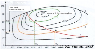 2013年5月6日更新:大好消息:找到一张大众1.4TSI发动机的工作效率图(见 加图1)。此图与正文中的图3一个解释道理。图中100%处为发动机最优工作点,此时转速2800,负载80%。 我们还可以从图中发现转速的提高减少对发动机效率的提升并没有太大帮助,而负载的提高却大大提升效率。图中A点3600转负载35%,B点2200转负载60%,效率只差达到20%!加图1更新:不少坛友反映此贴太难看懂,可能是我语文水平不高,没有表达清楚。我再尝试表达地清楚一些:我们平常说开车油耗都是按照每百公里多少油来衡量的。但事实上,同一辆车因为每个人开车方式的不同其油耗也必然不同。因此要讨论汽车油耗,最好是撇开人为因素,从发动机本身的工作...
