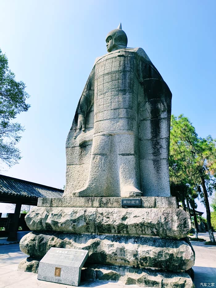 江边的周瑜雕塑巍然屹立!据说这是湖北省最大的人物石雕像,生动展示了东吴都督周瑜身着锐甲战袍,肩披斗篷,手持利剑,雄姿英发!