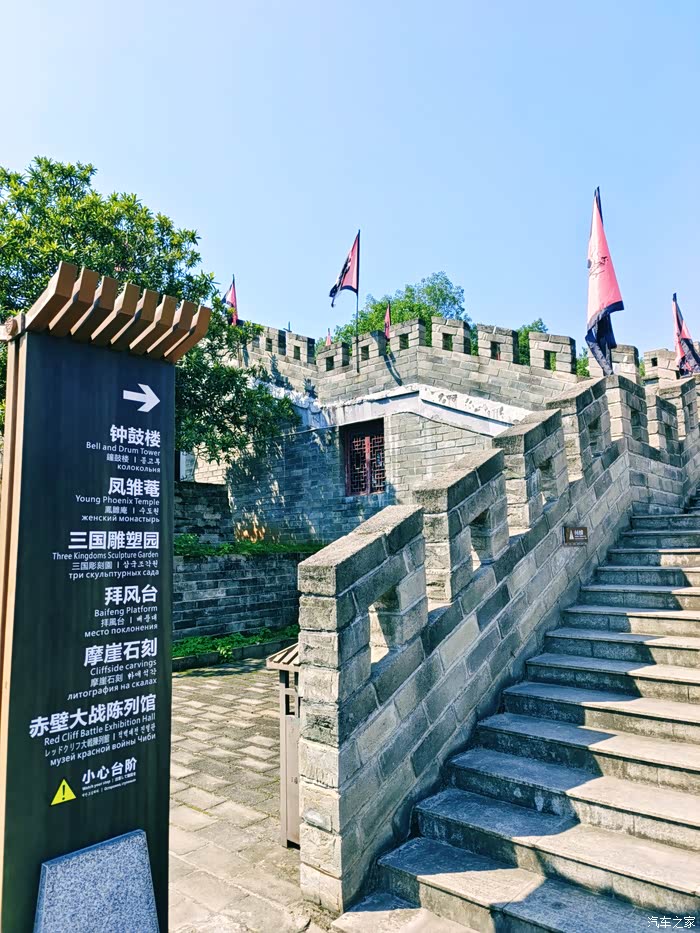 来到景区大门,先给老爸老妈来张打卡合照。景区正门雄伟壮观,正门上刻着“三国赤壁古战场”几个金色大字,门上建有门楼,左右各有侧门和箭楼。景区建筑风格全采用黑灰黄色,显得古朴、典雅、厚重,让你梦回三国。