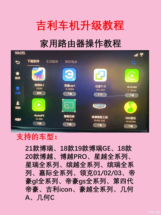 使用(家用路由器)给吉利车机升级安装第三方软件教程【保姆级教程】。吉利车友们快来试试吧!升级后车机新增多款软件,可以自行下载和安装。让你的车机解锁更多玩法,比如在车上看视频、听音乐、刷抖音等等!部分车型可以安装百度carlife或者亿连手机互联实现安卓互联以及高德地图红绿灯读秒!支持车型:21款博瑞、18款19款博瑞GE、18款20款博越、博越PRO、星越全系列、星瑞全系列、缤越全系列、缤瑞全系列、嘉际全系列、领克01/02/03、帝豪gl全系列、帝豪gs全系列、第四代帝豪、吉利icon、豪越全系列、几何A、几何C等车型#吉利车机升级 #吉利汽车 #车机升级 #安装第三方软件教程#车机互联