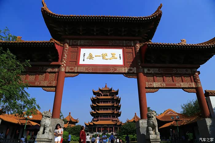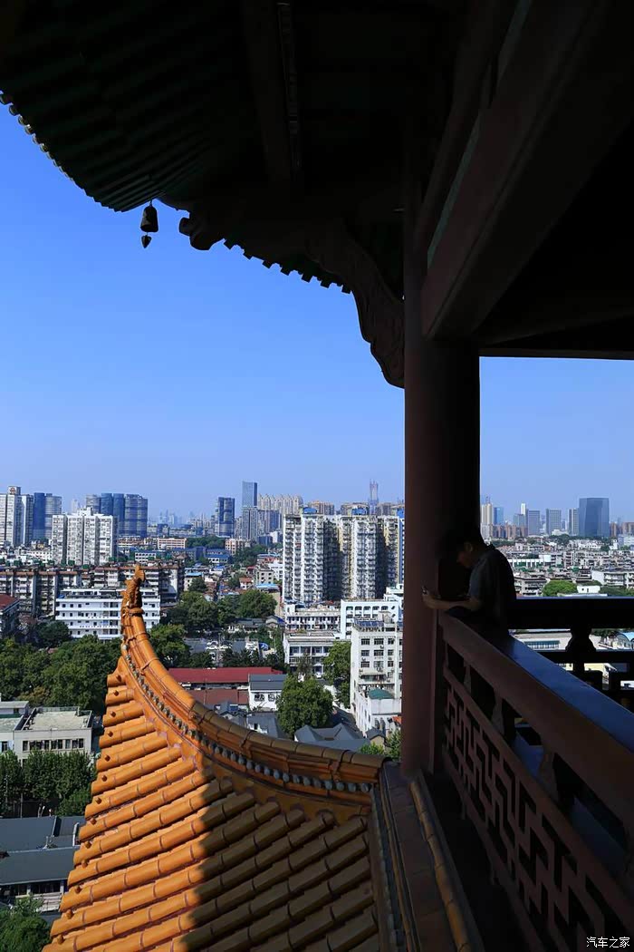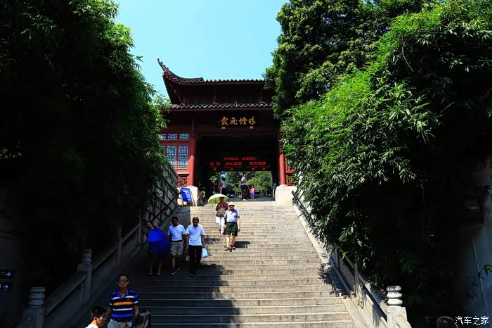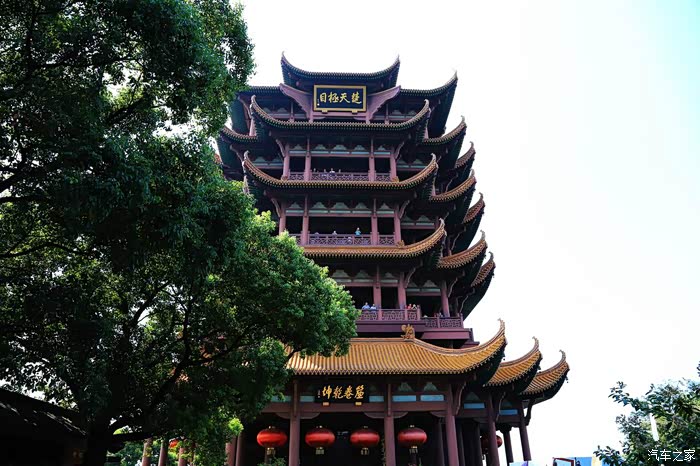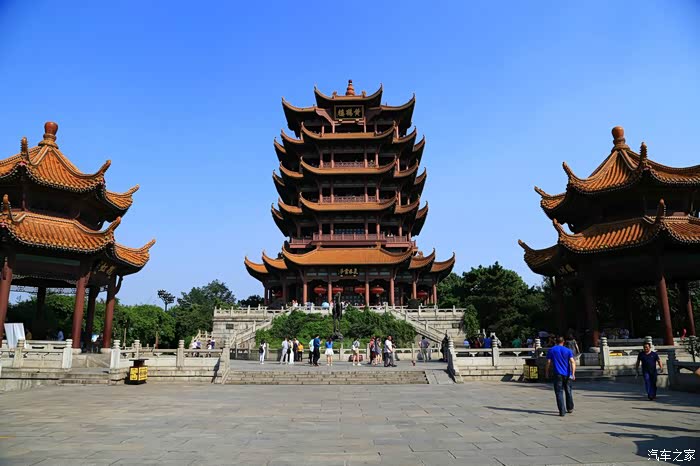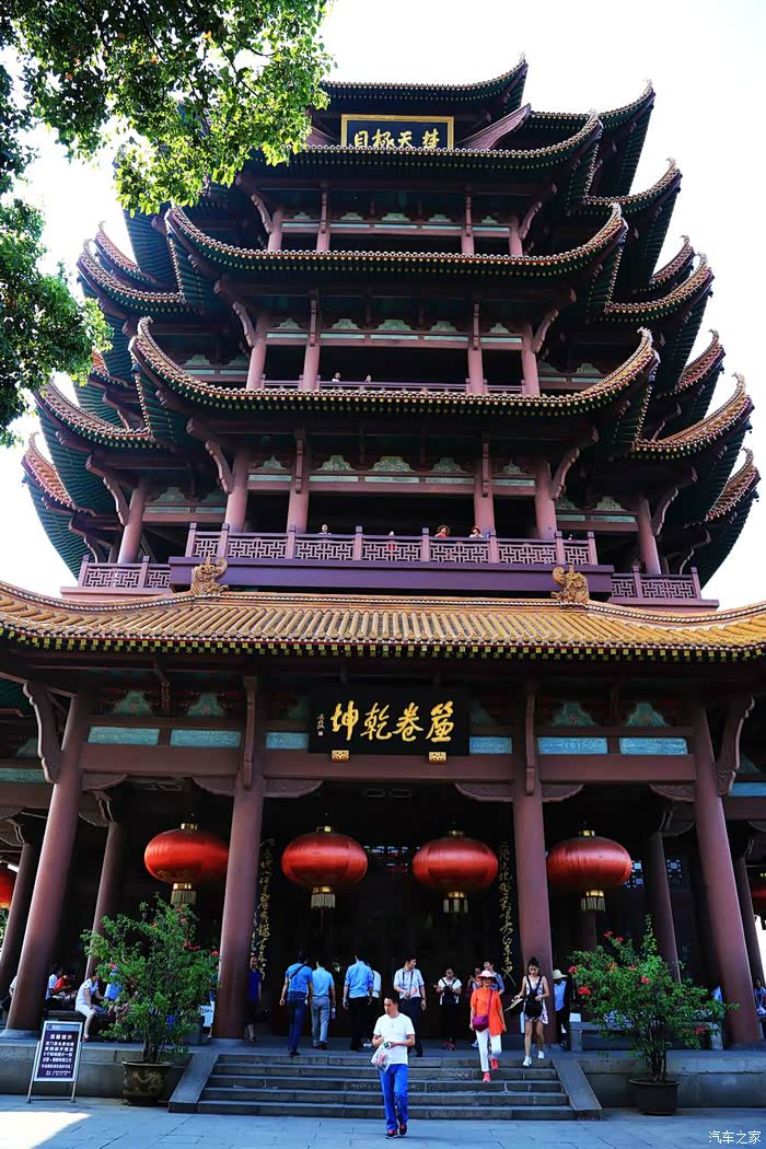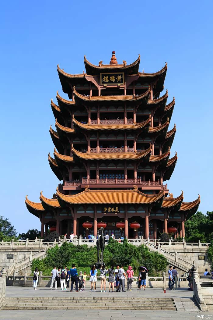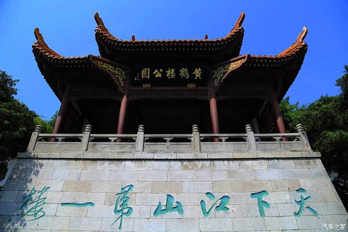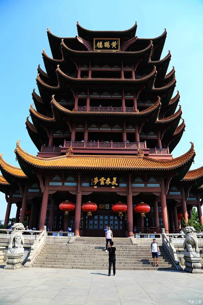 黄鹤楼位于湖北省武汉市长江南岸的武昌蛇山之巅,为国家5A级旅游景区,享有“天下江山第一楼“、”天下绝景“之称。黄鹤楼是武汉市标志性建筑,与晴川阁、古琴台并称“武汉三大名胜”。该建筑也与湖南岳阳楼、江西南昌滕王阁并称为“江南三大名楼”。黄鹤楼始建于三国时代吴黄武二年(公元223年)。唐代诗人崔颢在此题下《黄鹤楼》一诗,李白在此写下《黄鹤楼送孟浩然之广陵》,历代文人墨客在此留下了许多千古绝唱,使得黄鹤楼自古以来闻名遐迩。黄鹤楼坐落在海拔61.7米的蛇山顶,京广铁路的列车从楼下呼啸而过。楼高5层,总高度51.4米,建筑面积3219平方米。黄鹤楼内部由72根圆柱支撑,外部有60个翘角向外伸展,屋面用10多万块黄色琉璃瓦覆盖构建而成。黄鹤楼楼外铸铜黄鹤造型、胜像宝塔、牌坊、轩廊、亭阁等一批辅助建筑,将主楼烘托得更加壮丽。主楼周围还建有白云阁、象宝塔、碑廊、山门等建筑。整个建筑具有独特的民族风格,散发出中国传统文化的精神、气质、神韵。它与蛇山脚下的武汉长江大桥交相辉映;登楼远眺,武汉三镇的风光尽收眼底。今年女儿高考被湖北大学录取,虽然有些不理想,但是能去九省通衢的华中重镇武汉去读书,也还是能凑活吧!自网上查询到被湖北大学录取后,就计划着自驾路线(压根就没想着坐飞机与火车去),这不,一路上经过西安、十堰、武当山、神农架、秭归屈原故里、宜昌两坝一峡,最后到了目的地武汉。因为湖北大学一年级是在新洲区阳逻校区,距离武昌主校区大约40多公里,所以先去阳逻校区报名后,再来武昌。当时打算坐公交,一看倒车费事,索性就开车进武汉市区啦(毕竟咱曾经自驾过北京市区,哈哈),结果在武汉长江大桥上中枪了,因为大桥实行的单双号通行,咱是双号,在单日通行啦,扣6分、罚款200元。其实,外地人来武汉,除了看东湖风景区,再就是看黄鹤楼与武汉长江大桥啦!我们也不例外。