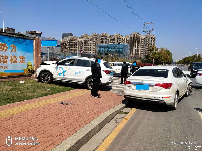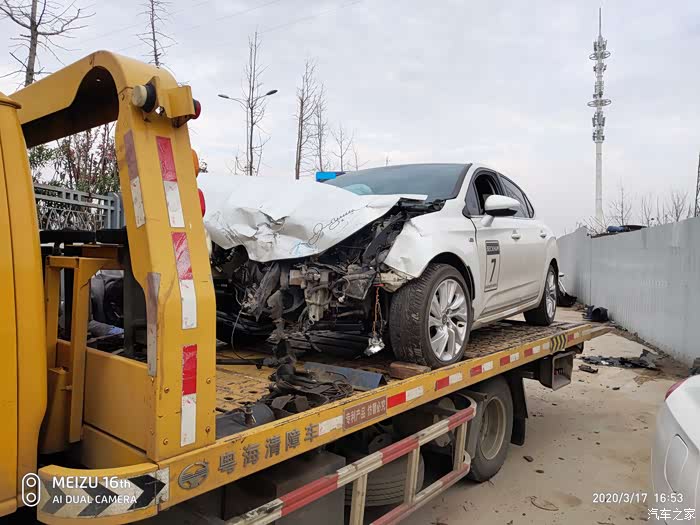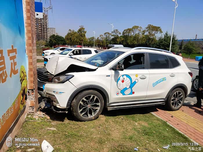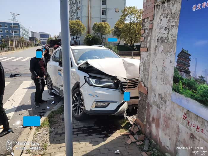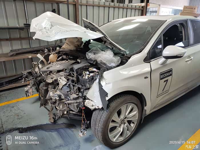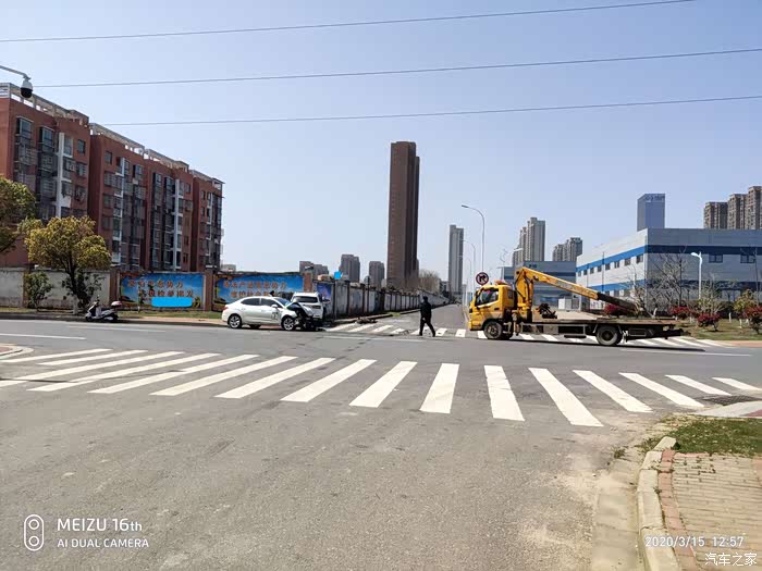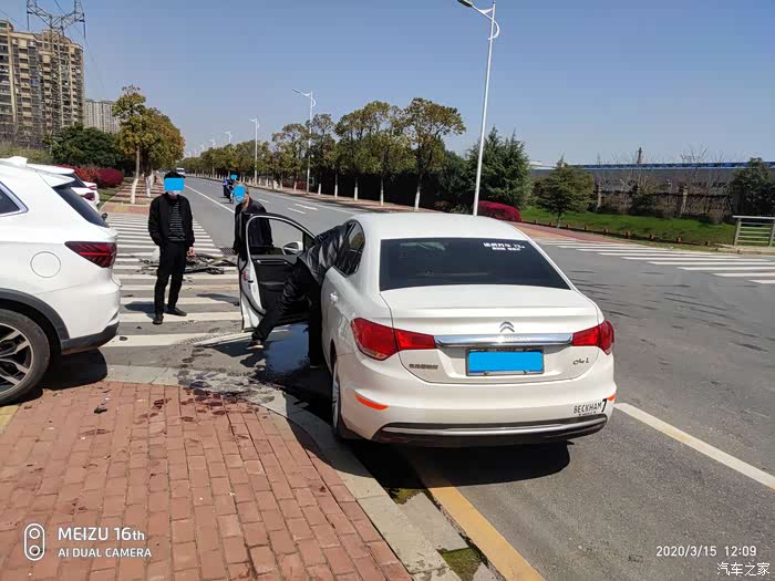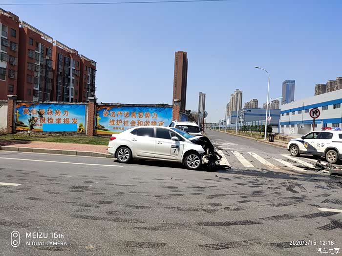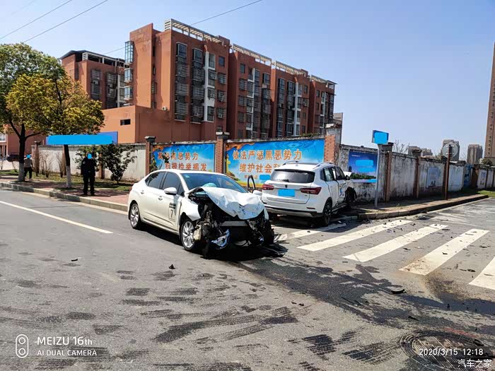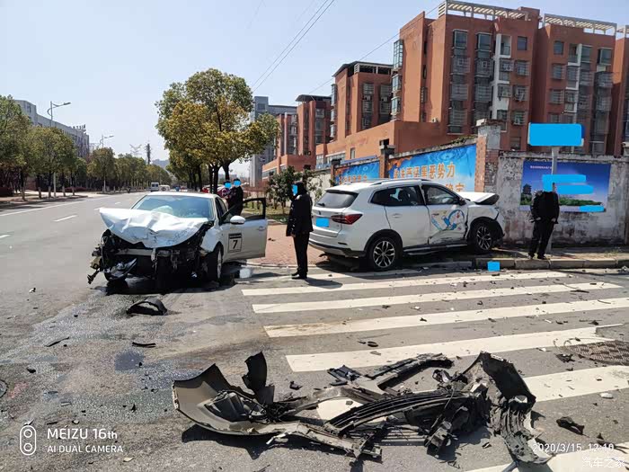 在经过一个很小的十字路口时,我的方向上没有任何停车线,人行道等,只有地面直行的箭头,也许是我根本就没留意这个路口,也许是我完全走神了,没有也许,眼前只看见白茫茫一片,下意识刹车到底,然后一声闷响,头脑瞬间特别清醒,能清楚的看到副驾和主驾的气囊缓缓弹出,机盖拱起,车头调转180度,然后停下。