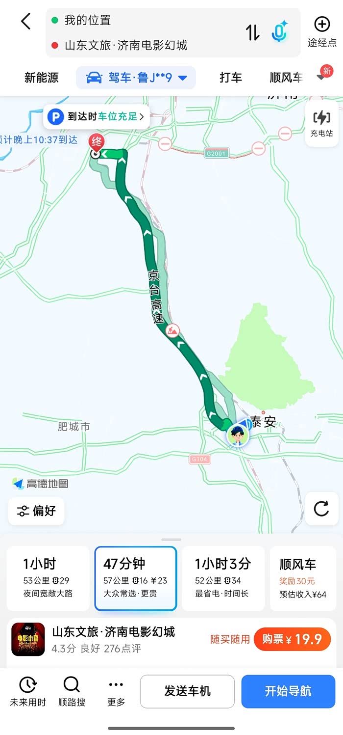 我是从泰安西出发,主路线走京台高速,全程大约1小时。具体路线是:泰安市区→京台高速(济南方向)→大学路→济南电影幻城。沿途会看到数不清的山,行驶在山峦之间,穿梭于山脚之下,感受这美好的暑期,当你看到好多大学的时候,目的地就要到了。