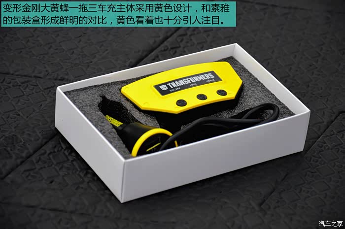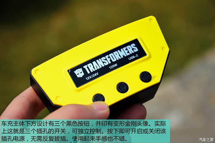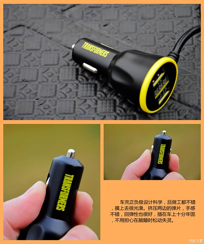 通过这次对变形金刚一拖三车充的众测,从获奖到收货,整个流程我都很满意。产品拿到手的第一印象就是用料足,黄色显得十分醒目,做工也是相当不错,摸上去手感很好,没有毛刺。我最喜欢两个USB接口和可独立控制的开关设计,细节处设计的很人性化。蓝色的灯光方便夜晚操作。自带的电压监测及预警功能相当实用,可以实时监测电瓶健康。包装盒内没有看到说明书有些遗憾,但这个对于年轻人来说也用不到,只是看上去显得不太严谨,希望能得到改善。总的来说,这款产品还是值得拥有的,它比起市场上五花八门的车充来说,质量更加可靠有保障。