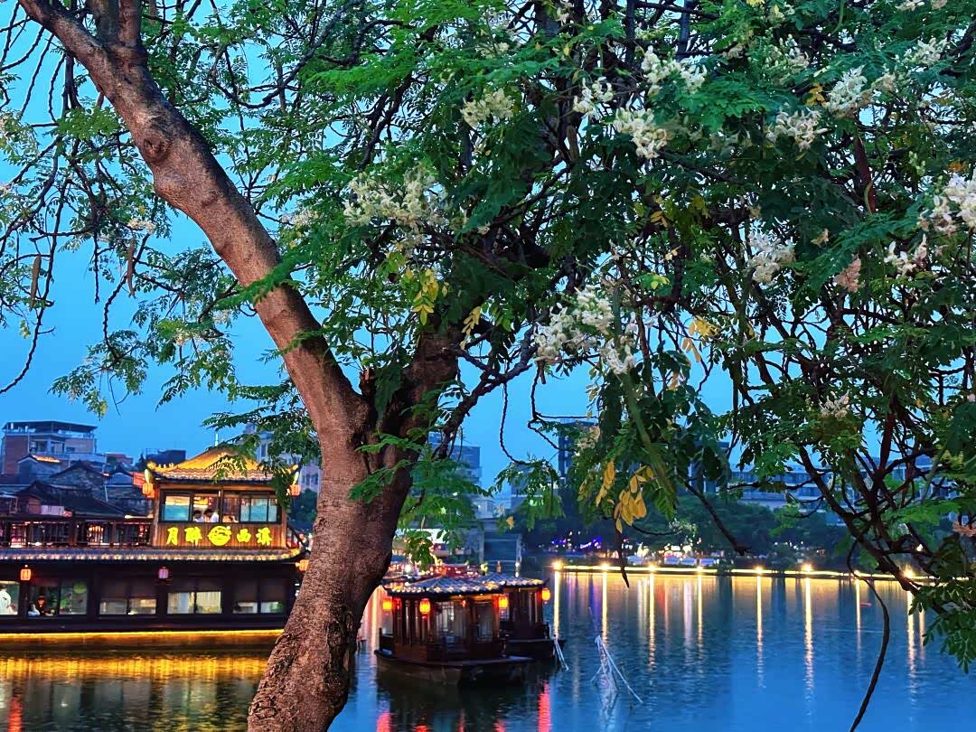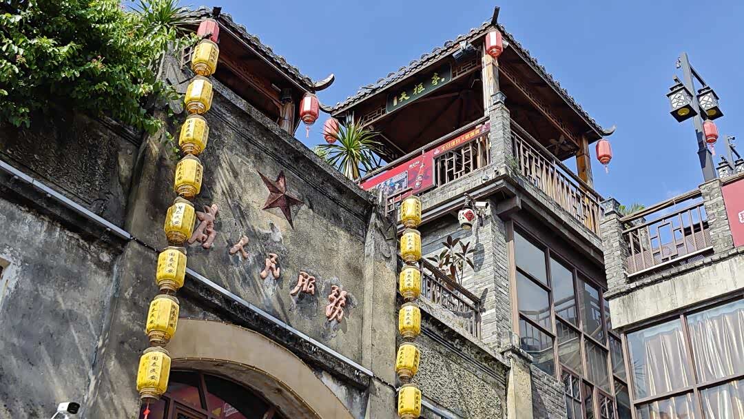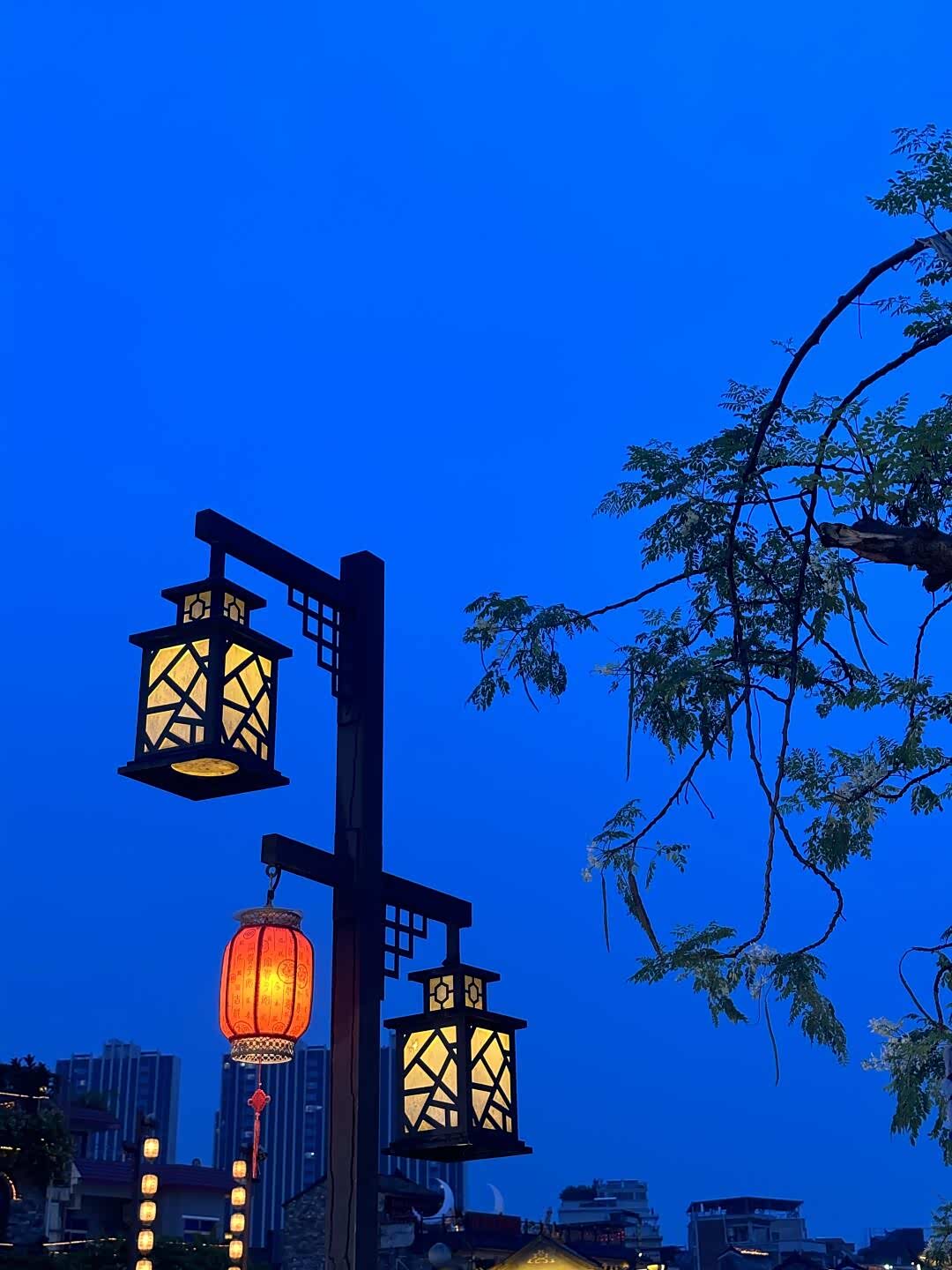 17:30回到古村看夜景,夕阳西下时,街头巷尾亮起特色灯饰,百年古村的夜生活刚刚开始。偶遇舞龙表演,锣鼓声中金龙翻腾,儿子追着龙尾跑,女儿吓得躲在我身后又偷偷偷看。