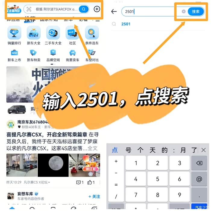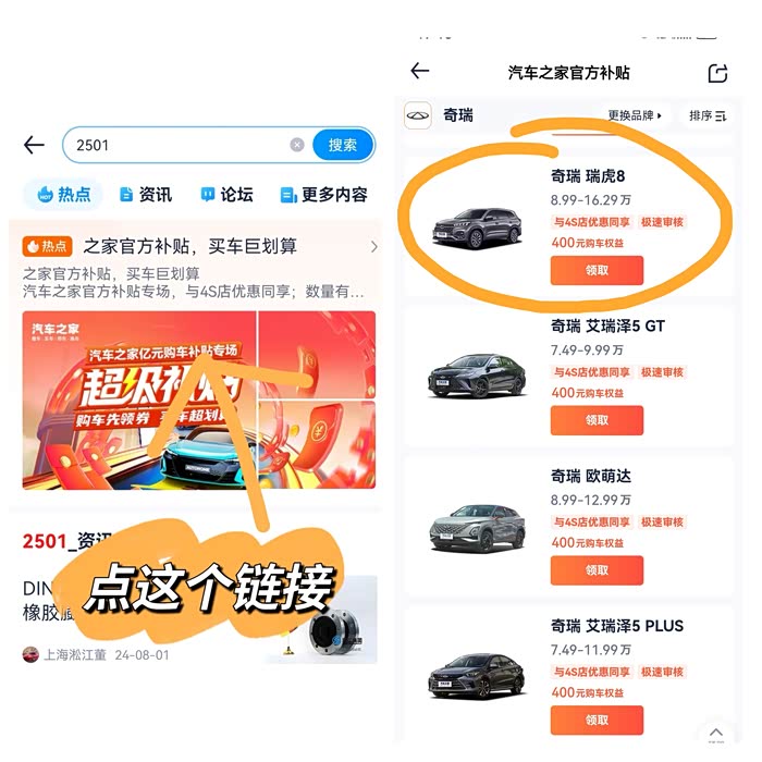 方法2:打开汽车之家App,搜索2501,点击超级补贴活动进入,切换到你所在的城市,输入想要购买的车型点击领取;