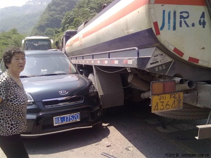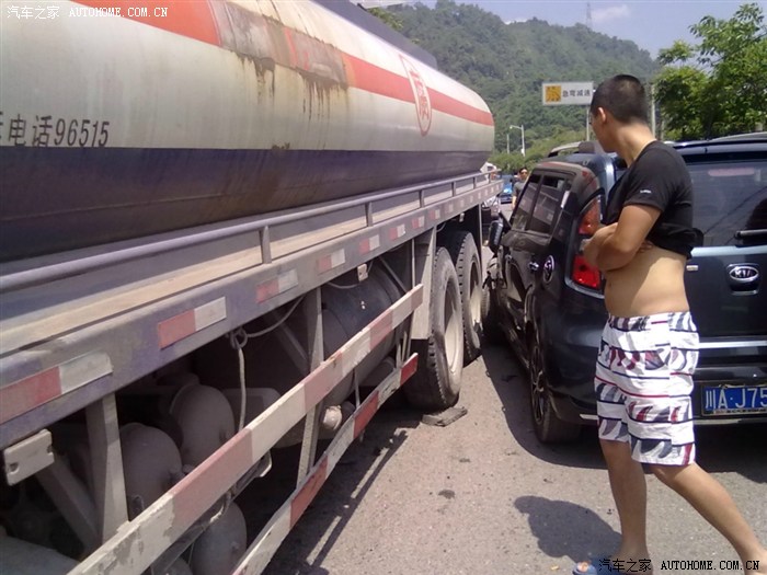 撞在这个货车屁股下。然后那个罐车往后倒才把车拉出来。