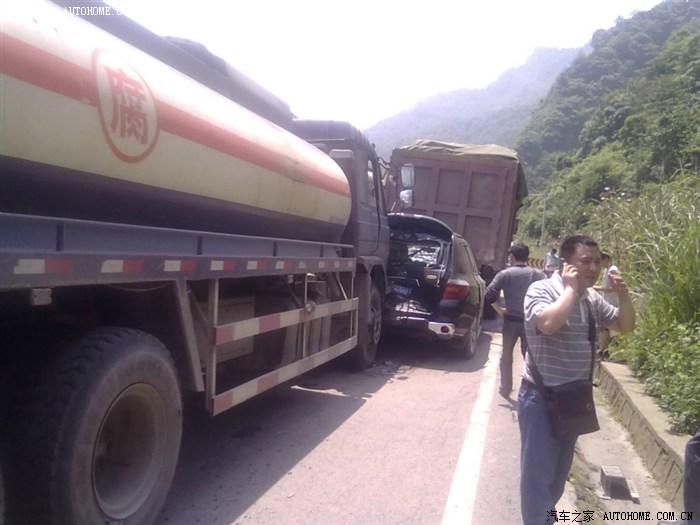 当时本来就单边放行。都堵了很多车了。打电话报警。等了两个小时交警才到还走路来的。先问有没有人员受伤。幸好没人受伤。我连皮外伤都没有。幸运啊。就是被吓惨咯。路都堵死完了。交警现场勘查拍了点照片。就开始疏导交通。都疏导了一个小时。等会拖车来把我的车拖走了。。罐车还能开就是水箱烂了。前面的大货车一点事都没有。叫我们去处理。 交警直接下责任书。罐车全责刹车都没刹过。下一步就是去定损了。朋友们帮我看下能修好不。。