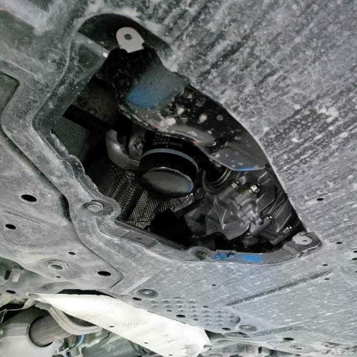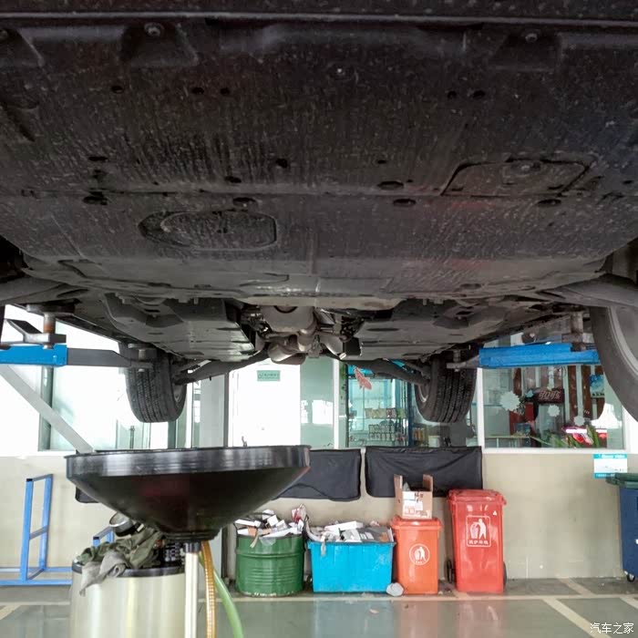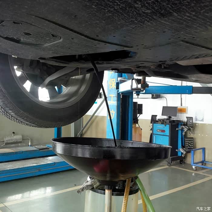 4.抬升汽车,更换机油格,放机油。放机油的同时检查胎压(是不是落车后检查胎压比较合适)。